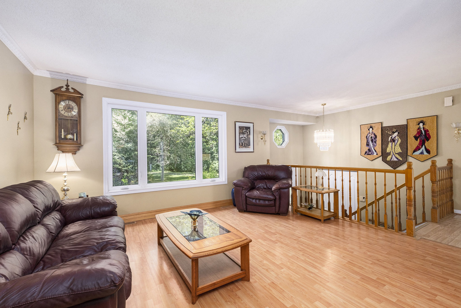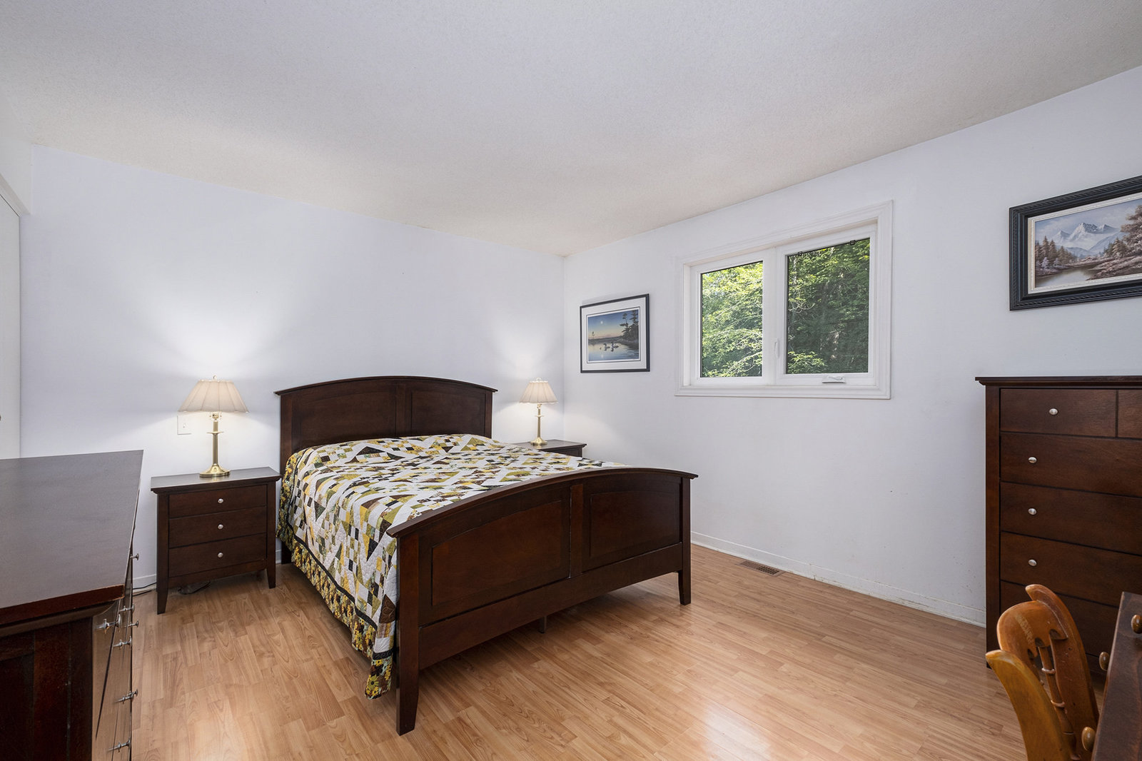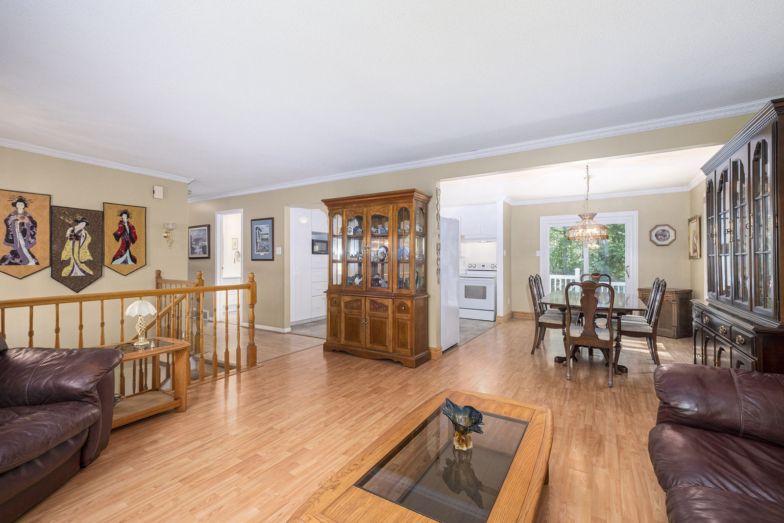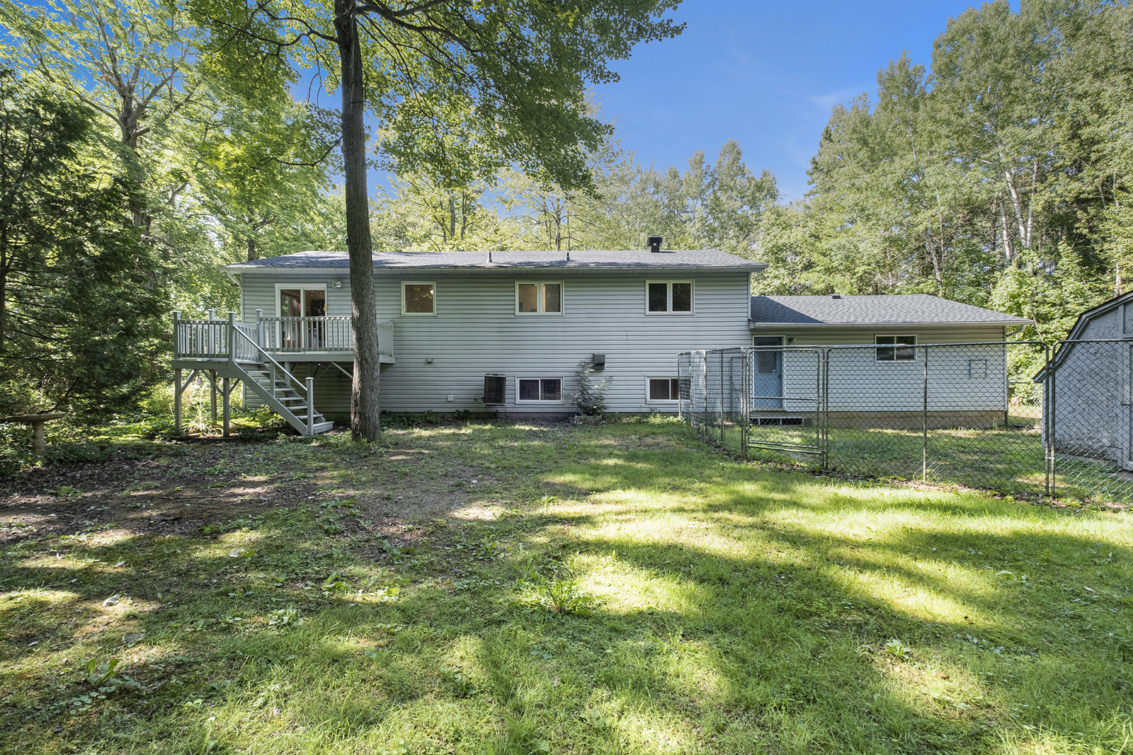 Inside, the spacious main floor offers three well-sized bedrooms, ideal for families or anyone seeking additional space. The open-concept kitchen is a highlight, seamlessly connecting to a formal dining area—perfect for hosting dinners or family gatherings. Large windows flood the interior with natural light, creating a warm and welcoming atmosphere. Step outside through the patio door onto a raised deck, an ideal spot for relaxing mornings, outdoor entertaining, or enjoying views of the peaceful backyard, which provides plenty of space for children, pets, or gardening.