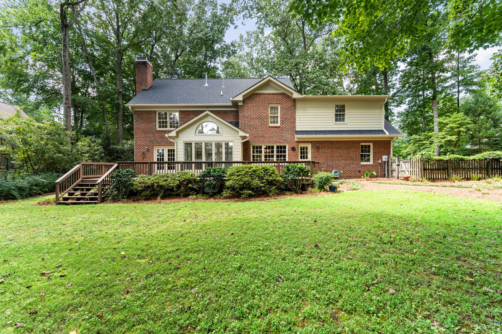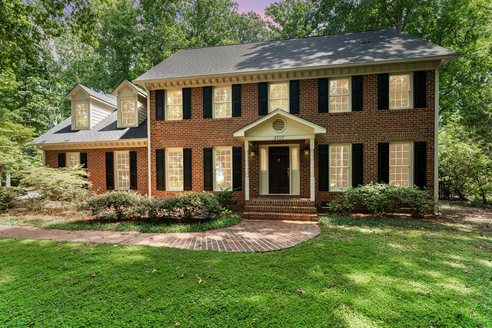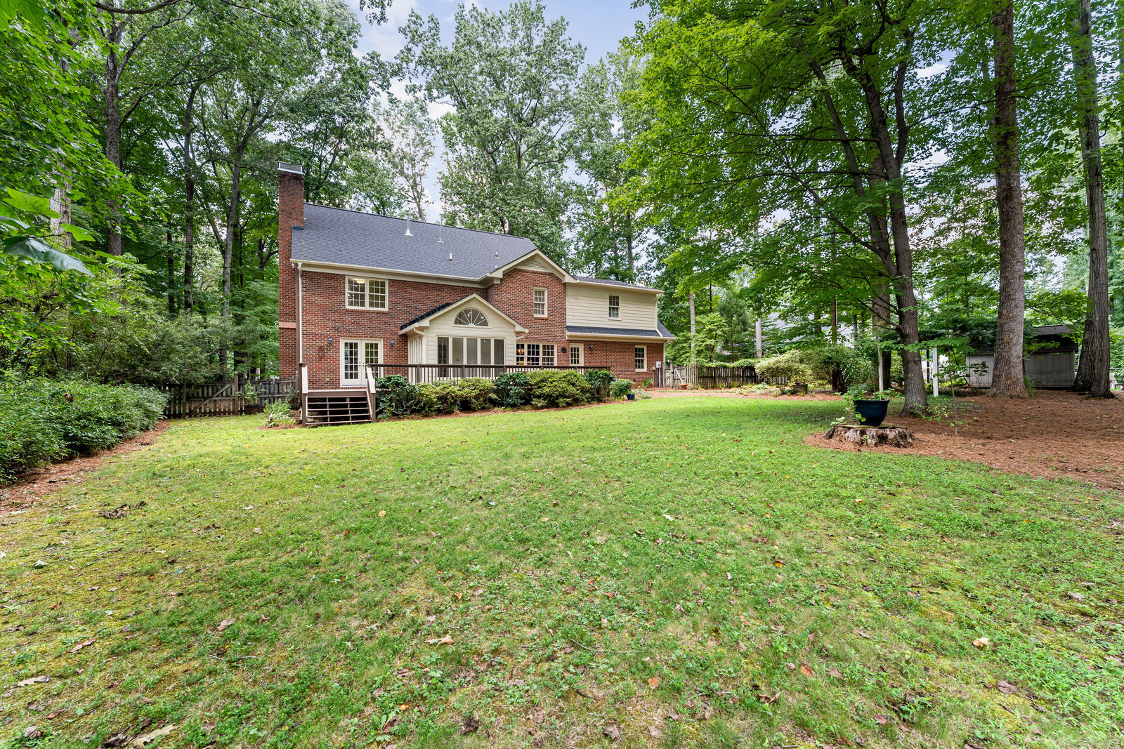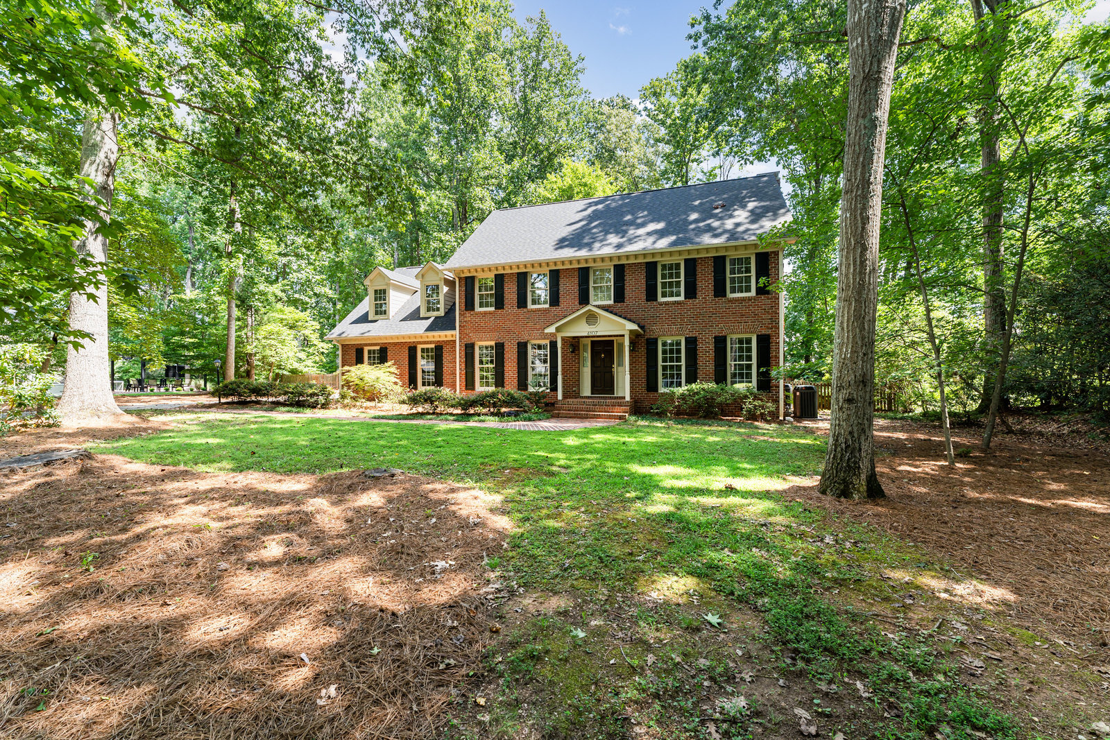 Stunning traditional brick home available in Sedgefield! Classic curb appeal set back deeply from the road on a large lot situated conveniently between Sedgefield Country Club, Grandover Resort & Spa, and Grandover Swim & Racquet Club. This traditional floor plan has well-appointed living spaces on the main floor with generously sized bedrooms and a playroom on the second floor. Primary suite enjoys two walk-in closets and a large en-suite bathroom. The spacious playroom currently connects to the primary suite but was originally separated by a wall and has its own staircase to the main floor. Side-entry 2-car attached garage provides convenience while maintaining the classic curb appeal. Storage room in the garage. Kitchen, breakfast nook, den, and sunroom all enjoy abundant natural light along the back of the house, connecting to a deck. Large backyard includes a shed, playset, natural areas, vine-covered pergola, and open lawn area. Large attic for additional storage. Roof 2022.