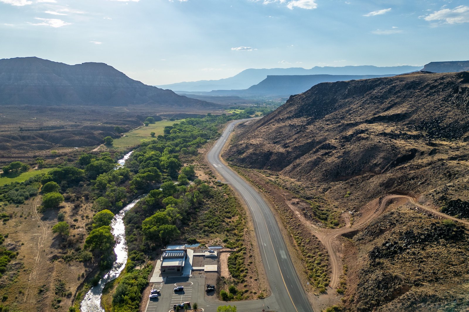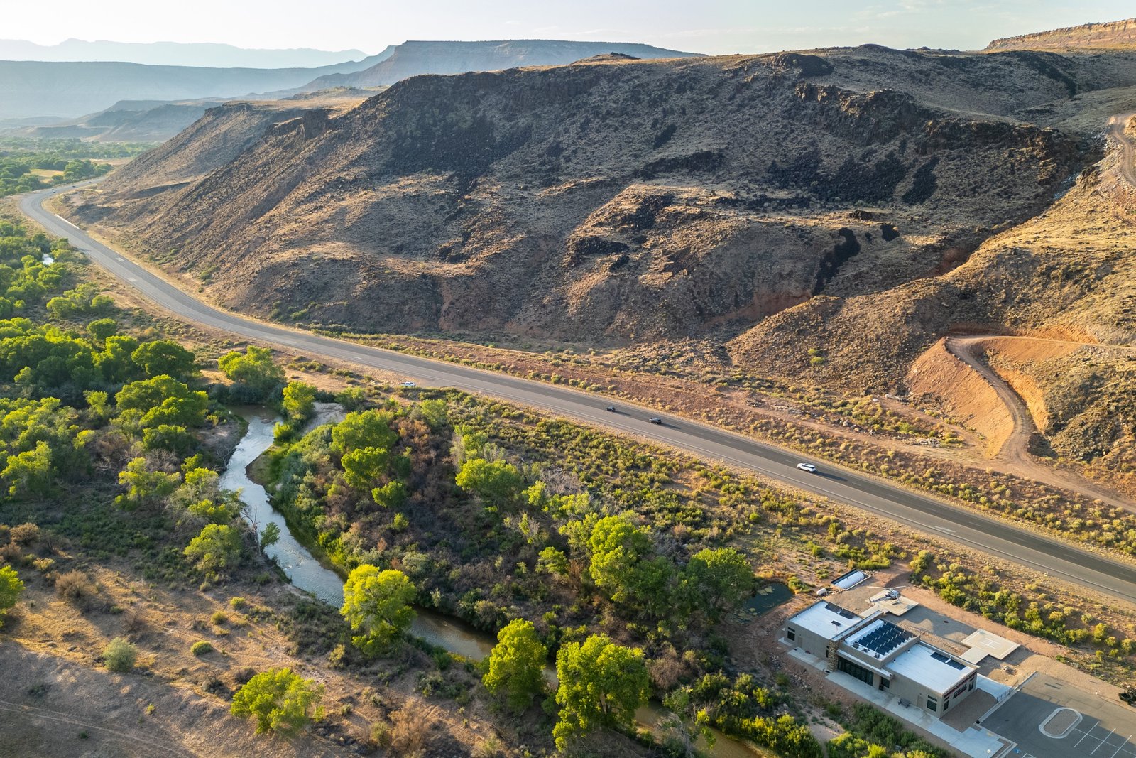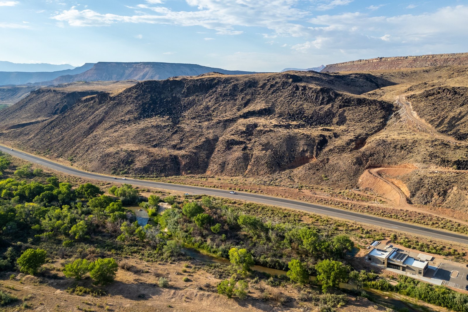 High Visibility opportunity with 2,755 linear ft of HWY frontage on both sides of SR-9 between Virgin and Rockville, including 2 Water Rights, on the way to Zion National Park. Washington County jurisdiction. Survey shows 3 possible building pads for a total of 4+ acres. Parcel includes Virgin River, flood plain and hillside. Located just west of Zion Helicopters.
