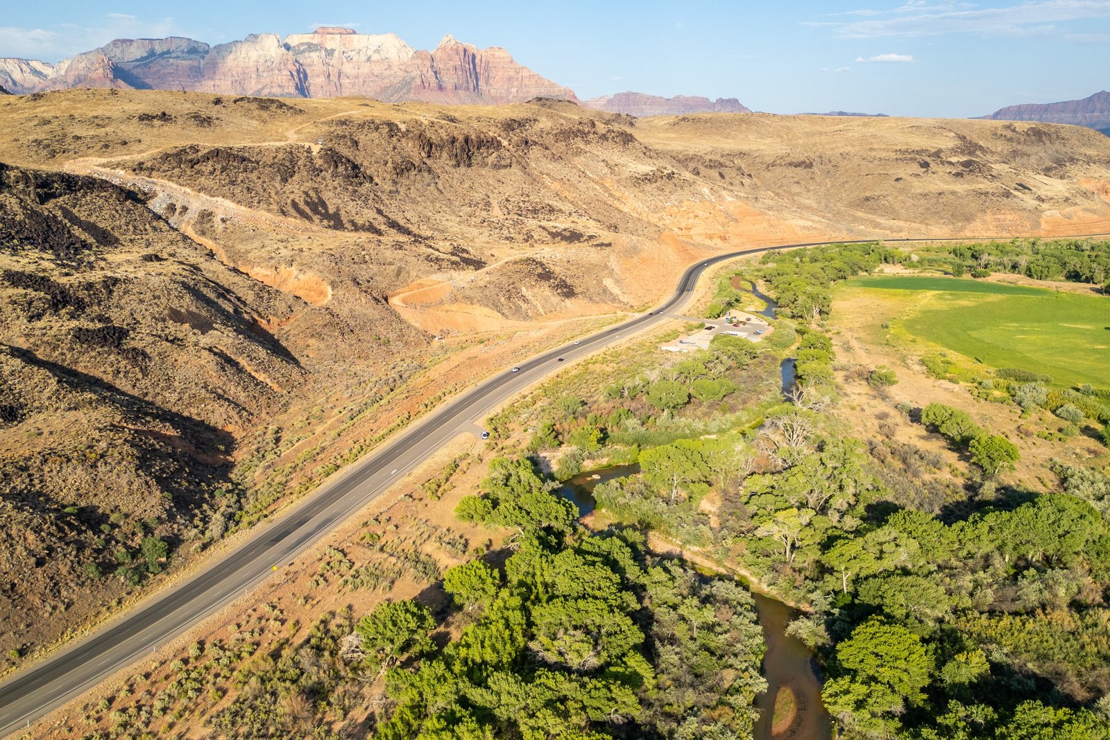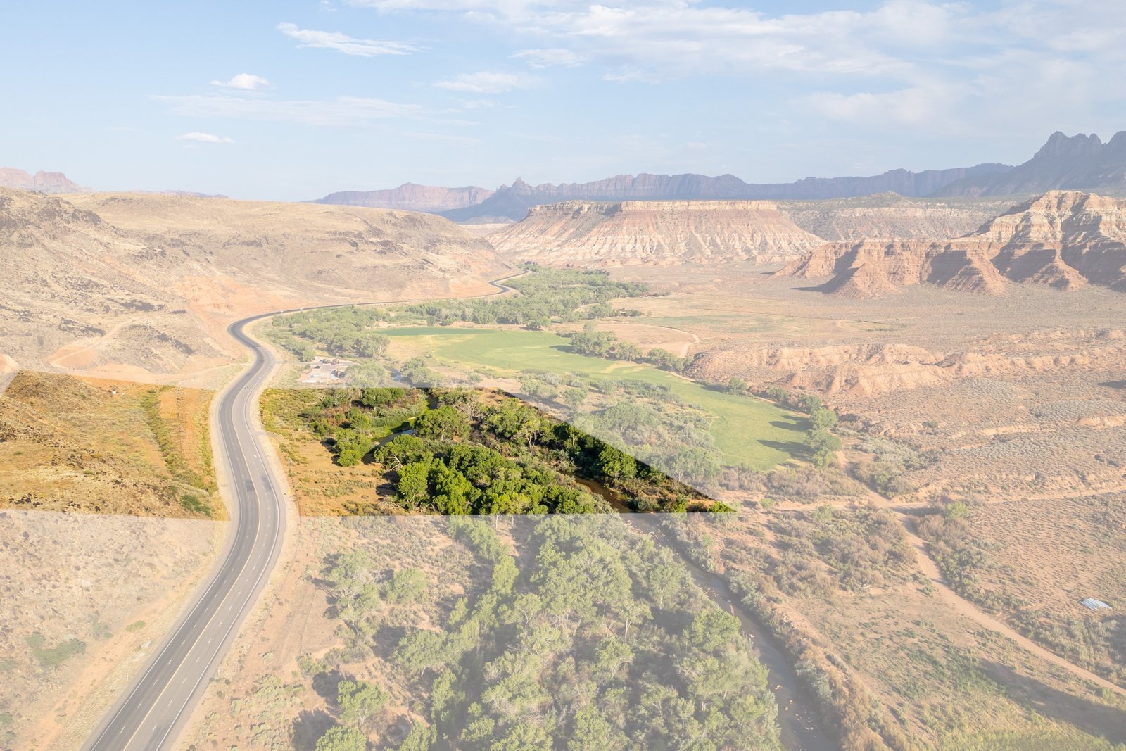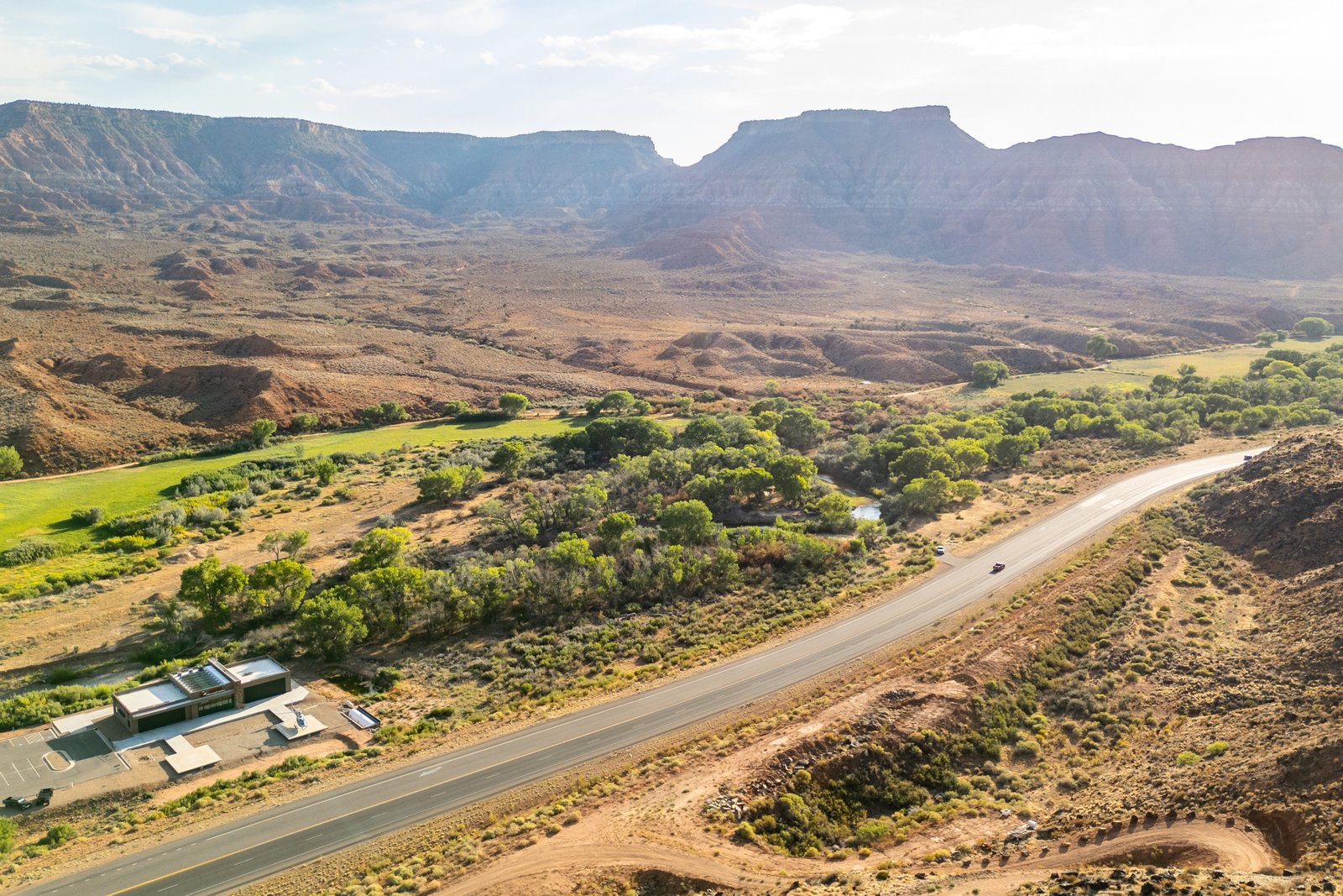 High Visibility opportunity with 2,755 linear ft of HWY frontage on both sides of SR-9 between Virgin and Rockville, including 2 Water Rights, on the way to Zion National Park. Washington County jurisdiction. Survey shows 3 possible building pads for a total of 4+ acres. Parcel includes Virgin River, flood plain and hillside. Located just west of Zion Helicopters.