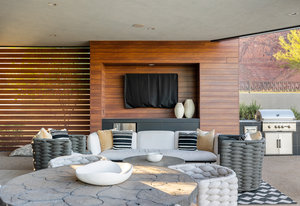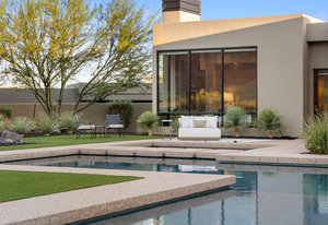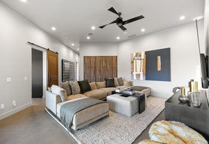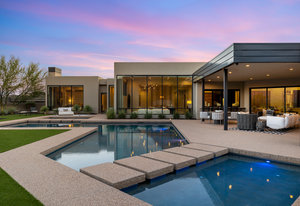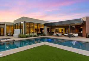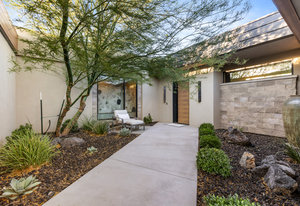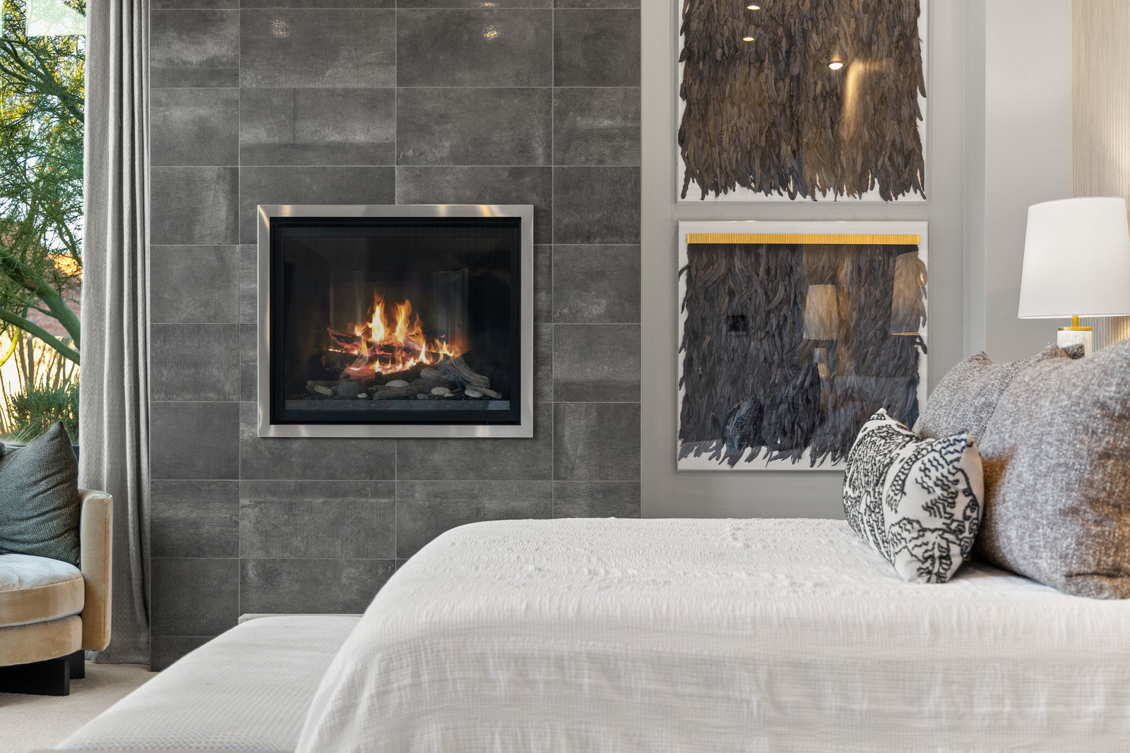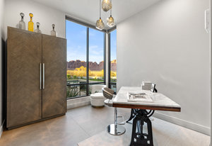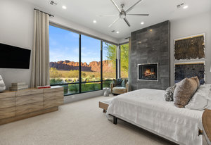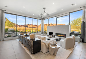 The main living area centers on a soft and elegant fireplace, while a flex room with sliding glass doors encourages true indoor-outdoor living. This residence offers 4 bedrooms and 4.5 baths, each thoughtfully designed, including a serene owner’s suite with fireplace, spa-like bath, and a massive walk-in closet with laundry. Modern comforts extend throughout with surround sound, a hidden concrete safe room, and advanced energy-efficient systems with zoned climate control and humidity management—rare for desert living.