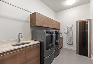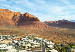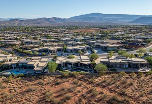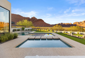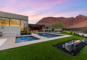 The 6-car garage with epoxy flooring and storage room is as functional as it is impressive. Outdoors, a resort-worthy escape awaits: a saltwater pool, dual lava rock fire features, a built-in BBQ, and a covered patio with TV—all set against the unmatched backdrop of Snow Canyon.