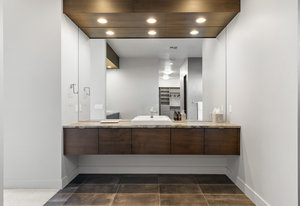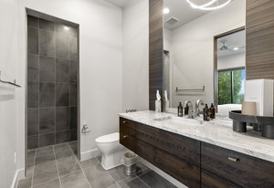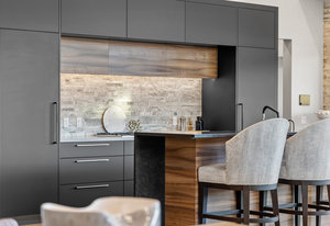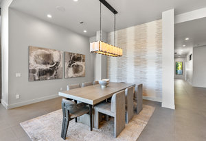 The heart of the home is its chef’s kitchen—a striking blend of matte black cabinetry, quartz and granite surfaces, and professional-grade The rmador appliances, including double ovens and a convection/steam oven. A bar that opens directly to the patio makes entertaining seamless, allowing gatherings to flow effortlessly between indoors and out.