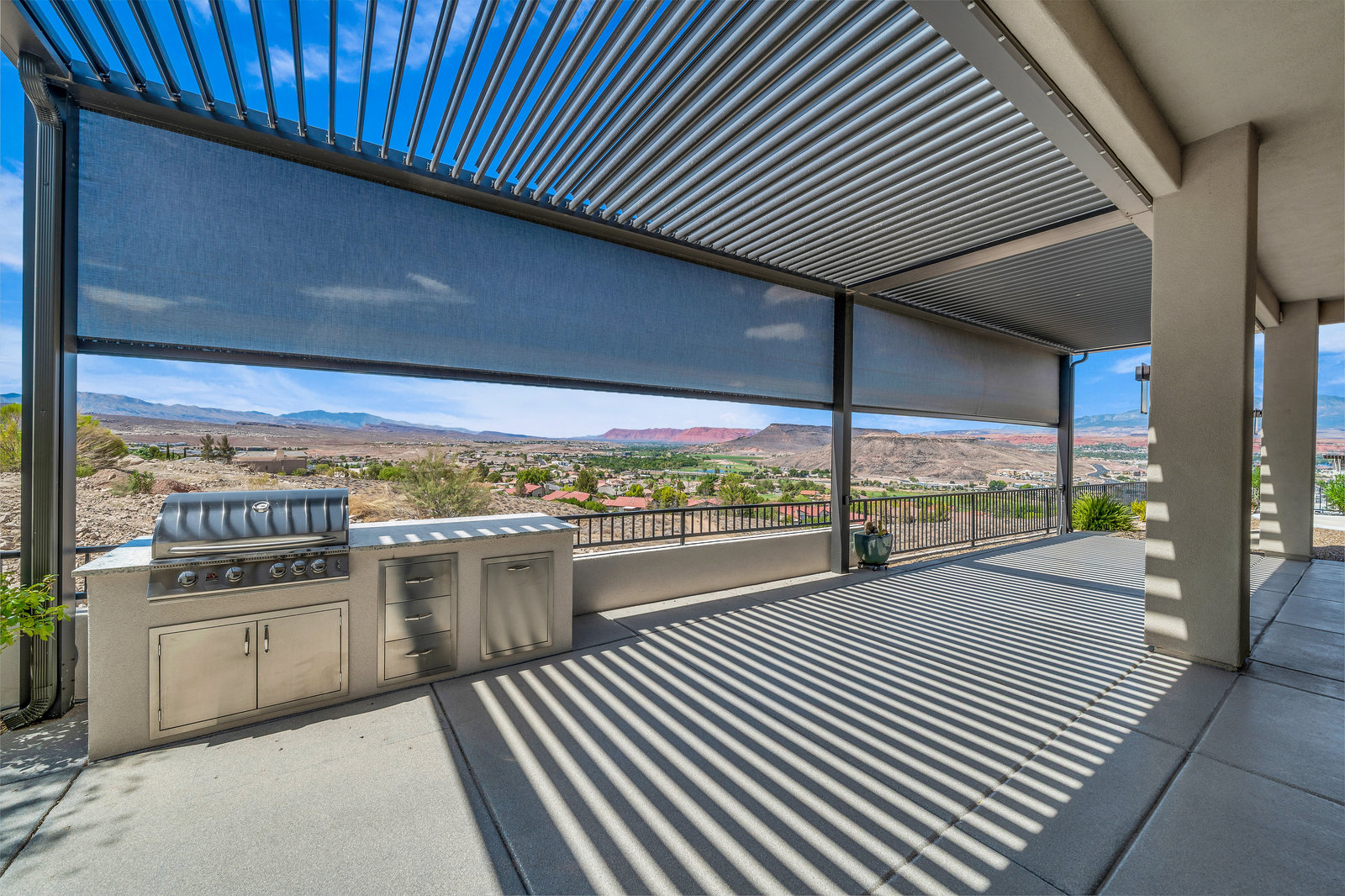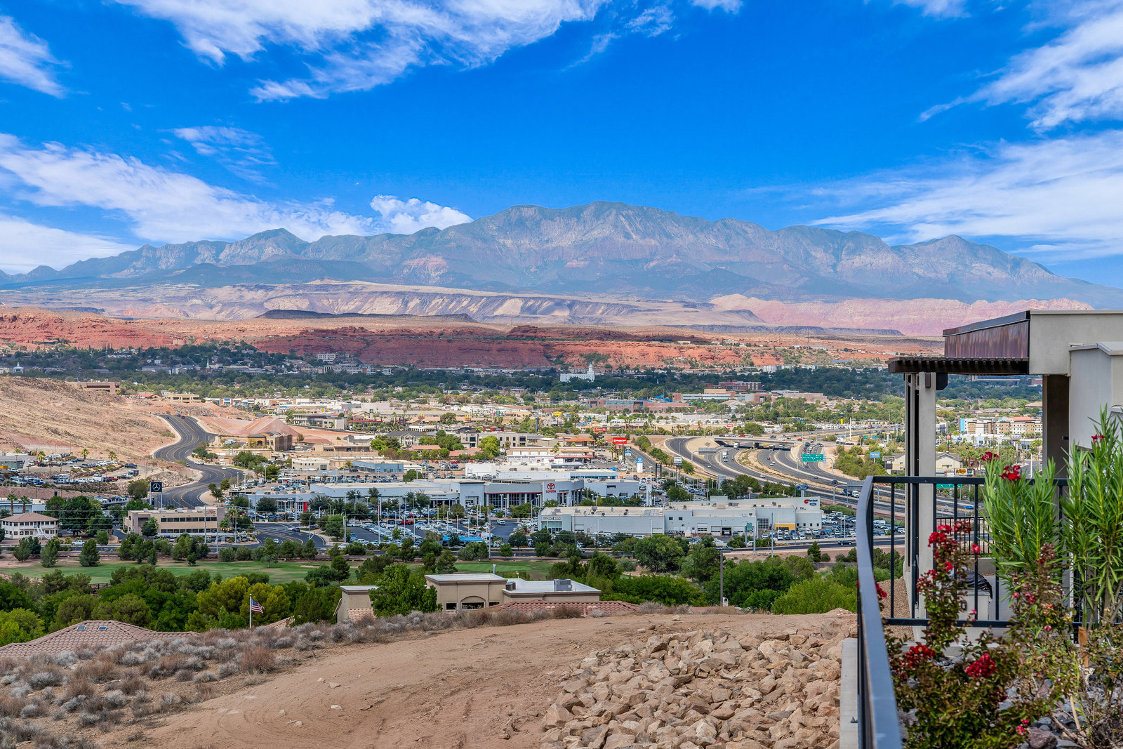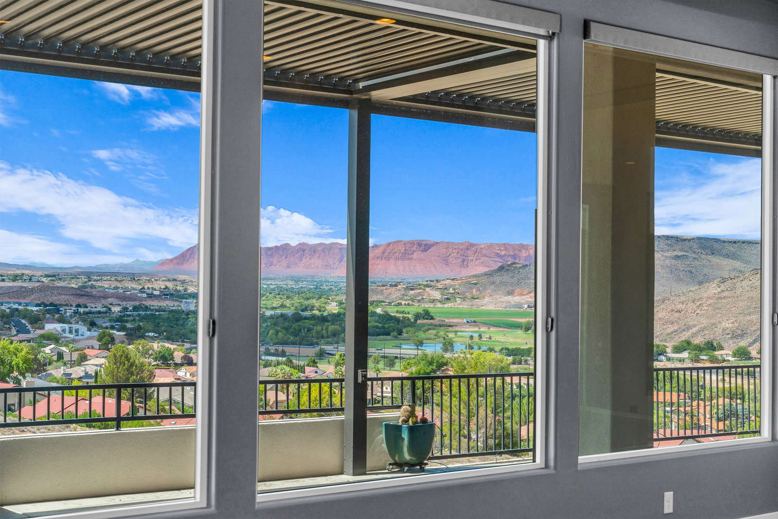 Perched in Southgate Hills, this warm contemporary home captures panoramic views of St. George, Green Valley, & the surrounding mountains. Inside, you'll find a bright open-concept layout w/ ceiling-height windows, sleek gas fireplace, & a gourmet kitchen w/ granite countertops, hidden pantry, and built-in beverage station. The primary suite features a spa-like bath & a custom walk-in closet with natural light. A guest room w/ courtyard entry is ideal for visitors or flex use. Step outside to enjoy a custom louvered patio with drop-down sunshades, gas fire pit, & built-in BBQ—all surrounded by low-maintenance xeriscaping. The 3-car garage includes epoxy floors, built-ins, ...