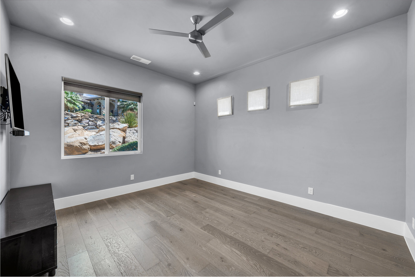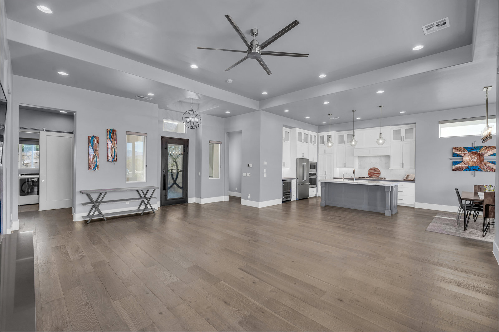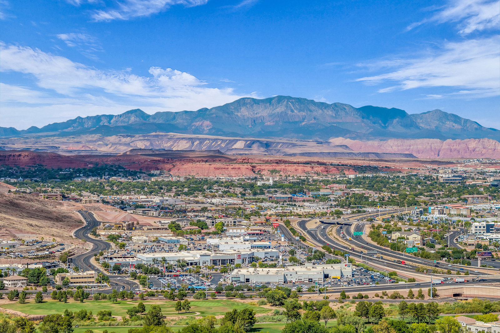 Perched in Southgate Hills, this warm contemporary home captures panoramic views of St. George, Green Valley, & the surrounding mountains. Inside, you'll find a bright open-concept layout w/ ceiling-height windows, sleek gas fireplace, & a gourmet kitchen w/ granite countertops, hidden pantry, and built-in beverage station. The primary suite features a spa-like bath & a custom walk-in closet with natural light. A guest room w/ courtyard entry is ideal for visitors or flex use. Step outside to enjoy a custom louvered patio with drop-down sunshades, gas fire pit, & built-in BBQ—all surrounded by low-maintenance xeriscaping. The 3-car garage includes epoxy floors, built-ins, ...