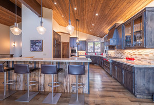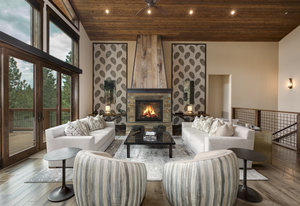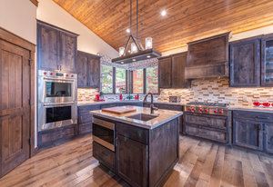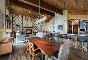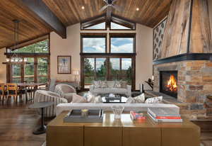 At the heart of the home, the chef’s kitchen is outfitted with premium appliances including a Wolf double oven, Wolf range top, 42-inch Sub-Zero refrigerator and abundant storage —perfect for entertaining and everyday living. The open-concept great room features soaring ceilings, a stone fireplace, and a mix of barn wood and steel accents, creating a spectacular welcoming space that connects seamlessly to the surrounding mountain views.