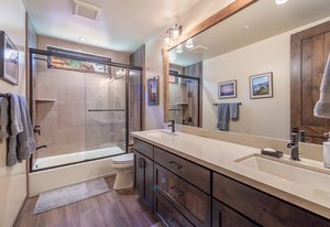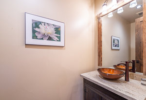 A separate family room with a wet bar and an additional stone fireplace, along with a dedicated office, provide flexible spaces for work, recreation, or hosting guests. Comfort-driven details include heated floors in all bathrooms, central air conditioning, hot tub and quality finishes throughout. The oversized two-car garage has been customized with storage lockers and racks to easily accommodate mountain gear and toys.