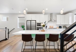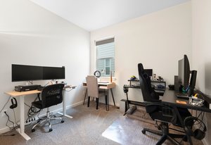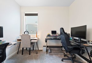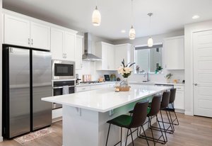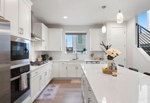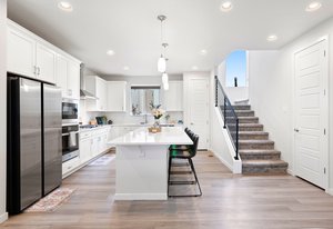 Step inside and discover a thoughtfully designed layout. The lower level offers a 2-car garage, a private office with sleek laminate flooring, and a generous storage closet. On the main level, modern cast-iron railings and laminate flooring carry throughout, complementing a stylish accent wall designed for your media center. Enjoy easy access to a balcony with open space views, along with another convenient storage room. The gourmet kitchen is the heart of the home, featuring crisp white cabinetry, quartz countertops, stainless steel appliances, and a spacious island that comfortably seats six—perfect for both everyday living and entertaining.