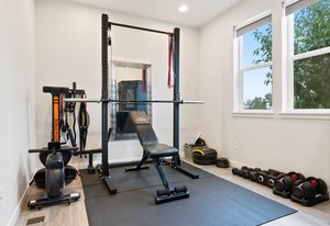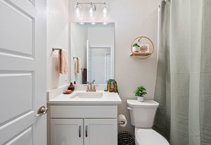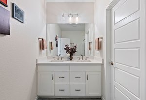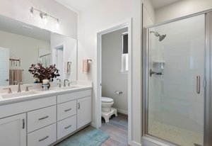 On the upper level, you’ll find the primary suite with a walk-in closet, dual-sink vanity, private water closet, and a beautifully tiled shower. Two additional bedrooms, a full bath, and a laundry room complete this floor.