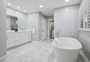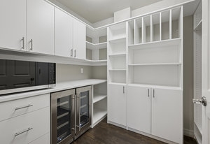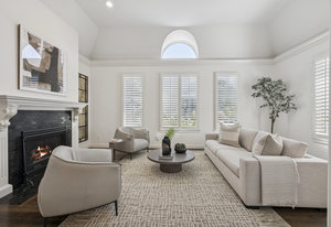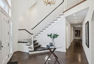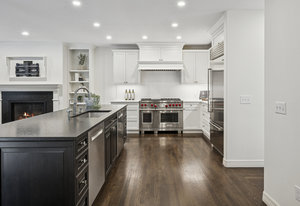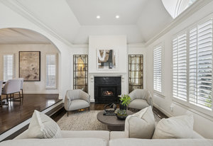 A grand foyer with a sweeping staircase sets the tone, opening to a formal living room with gas fireplace and a formal dining room designed for entertaining. The kitchen, appointed with premium appliances, custom cabinetry and an impressive walk-in pantry, flows seamlessly into a welcoming family room with its own fireplace. A butler’s pantry and a handsome main-level office with French doors and custom built-ins complete the main level.