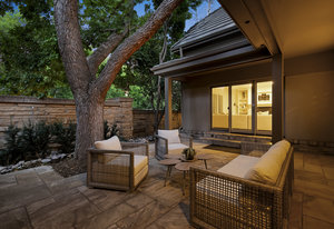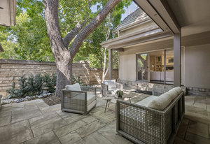 Outdoors, a private patio and landscaped courtyard are shaded by mature trees, creating an intimate extension of the living space. A three-car garage completes this rare offering in the heart of Cherry Creek, just moments from Denver’s finest shopping, dining, and cultural destinations.