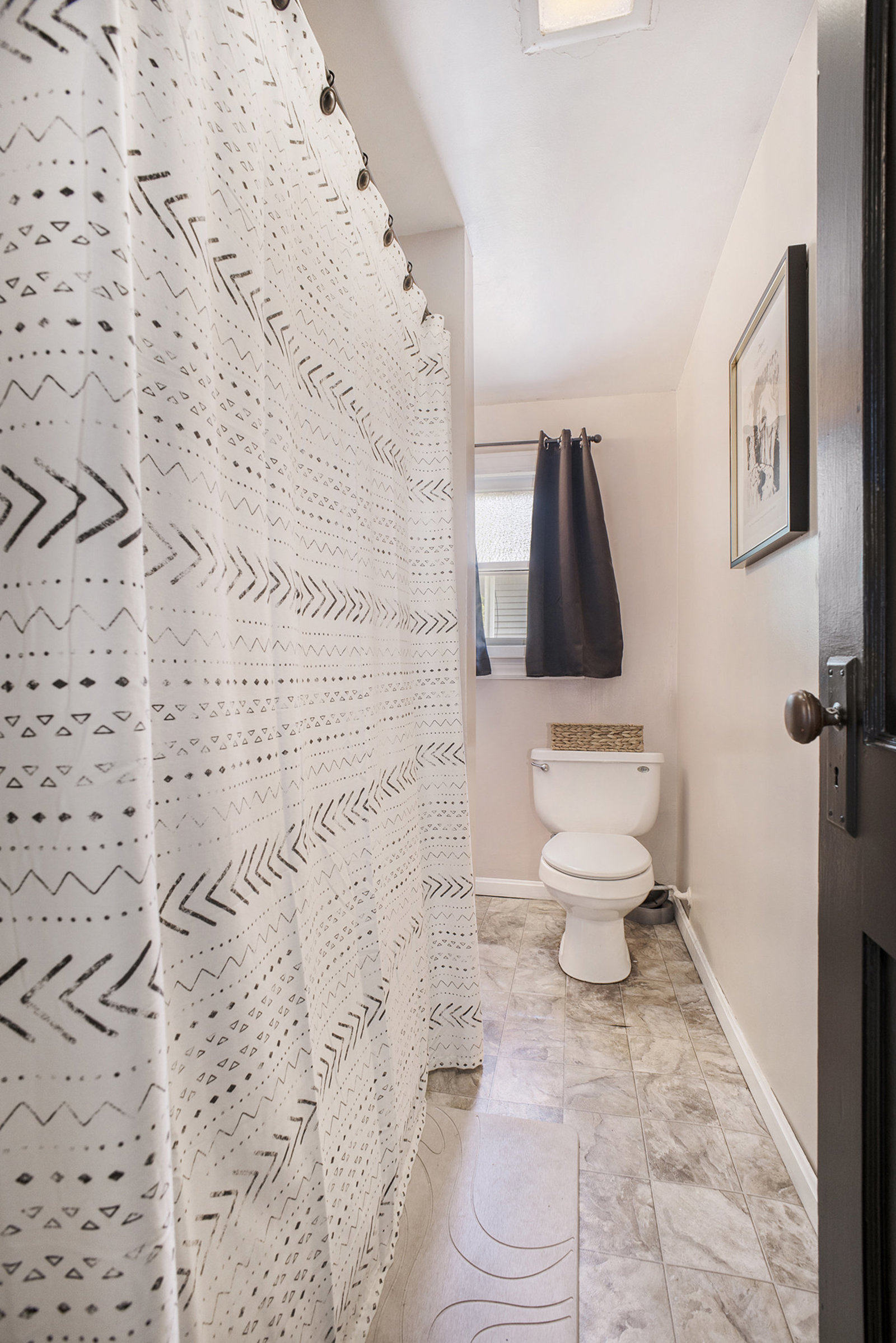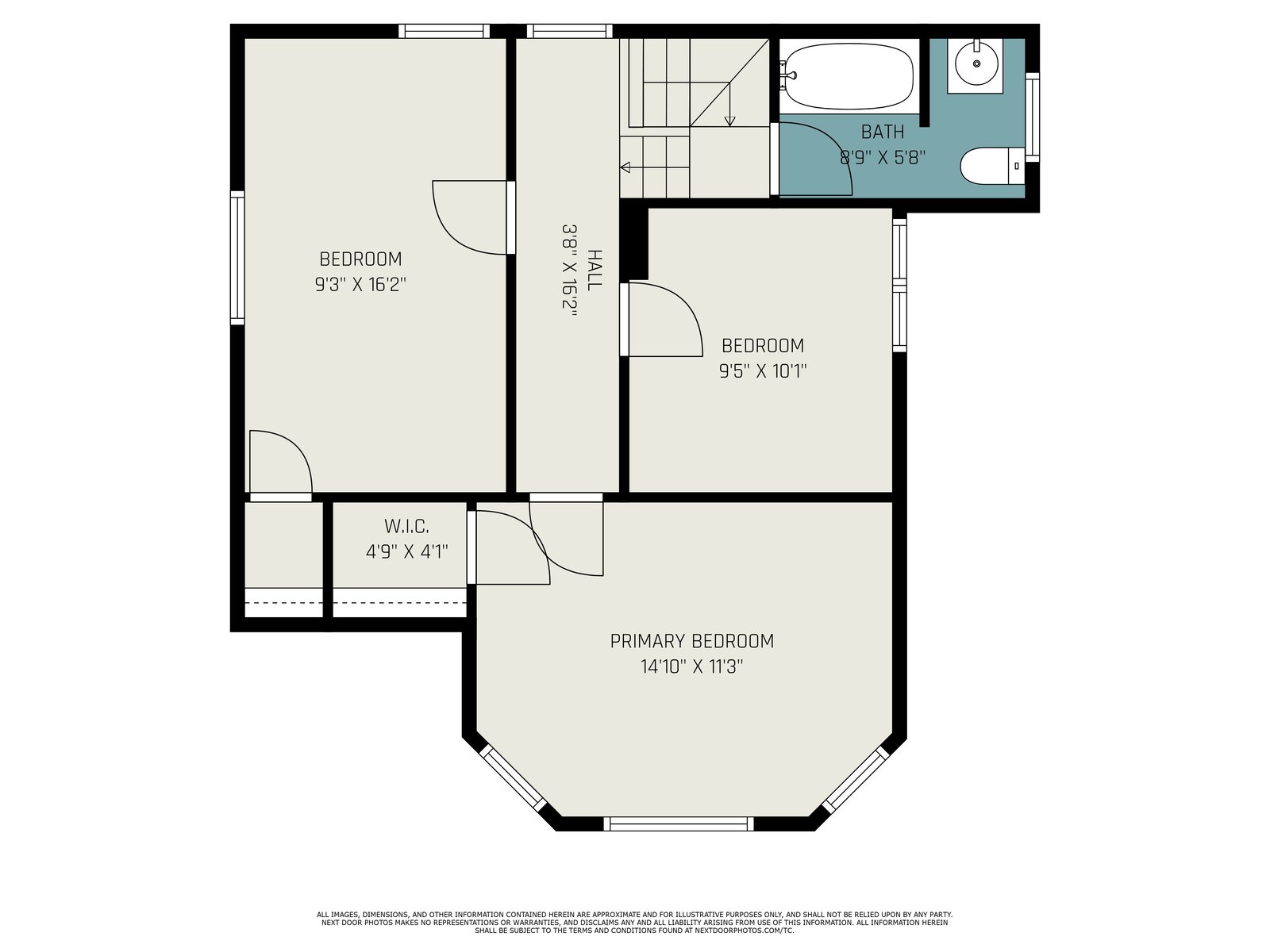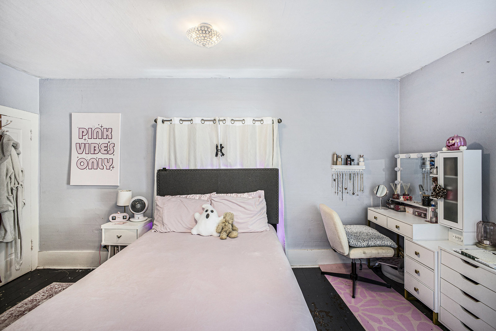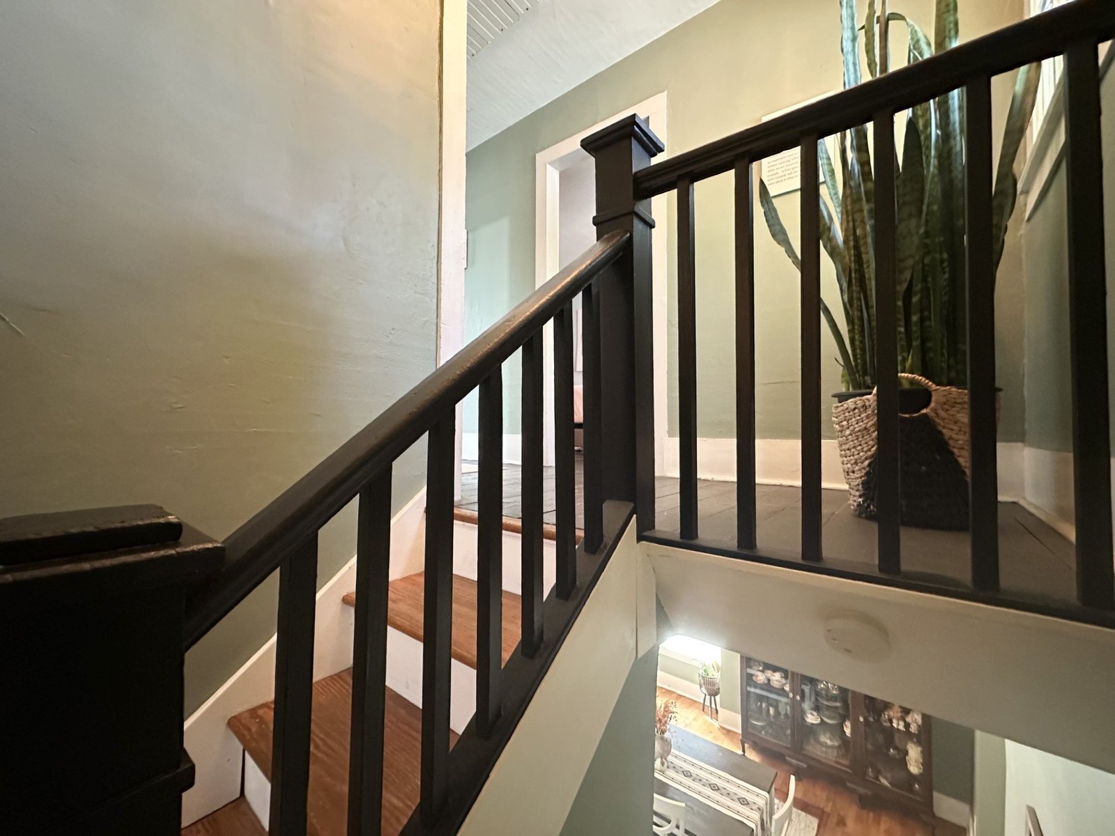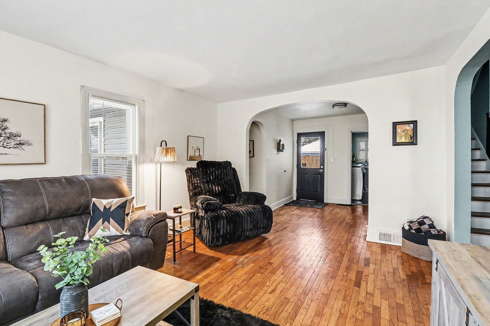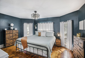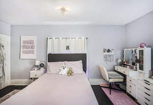 The open staircase leads upstairs to a full bathroom and two very spacious bedrooms, along with a fourth bedroom that has been transformed into a walk-in closet and makeup room—ideal for today’s lifestyle.