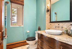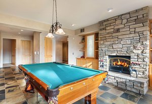 mountain style finishes. The main level features rare, reclaimed chestnut floors, a stunning, hand-carved limestone
