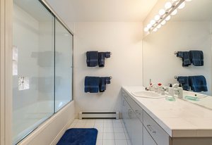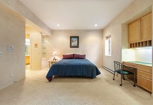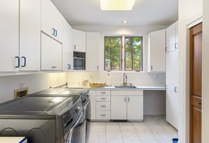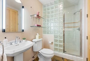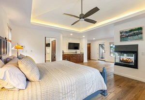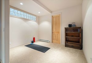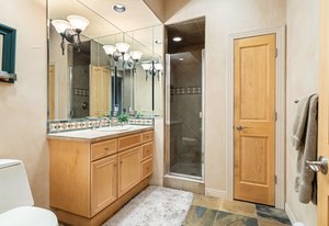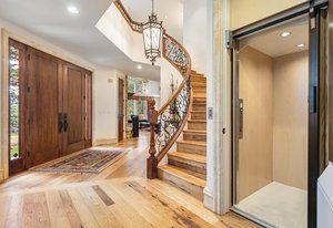 cabinetry with custom pull-out storage. The standout features are the custom-built refrigerator and wine cabinet with refrigerator drawers, seamlessly integrated to resemble furniture, further enhancing the kitchen’s timeless aesthetic and the gorgeous walk-through custom pantry tucked behind the kitchen itself. The adjacent dining room benefits from elegant maple finishes with Inkobal wood carvings adding artisanal charm. The recently updated primary suite impresses with a cozy three-sided fireplace, a spacious walk-in closet and a luxurious bath showcasing steam shower, soaking tub, farmhouse-style cabinetry and radiant heated modern flooring. An elevator connects all three levels, enhancing accessibility. Each bedroom includes an en suite bathroom, with the main floor bedroom offering handicap access via a