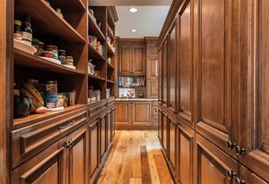 kitchen is both beautiful and functional, featuring a six-burner gas range, Wolf double oven, butler’s pantry with ice maker and thoughtful