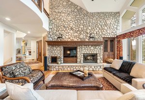 fireplace in the formal living room, and a river rock-accented wall anchoring the vaulted great room. A chef-designed