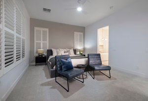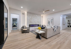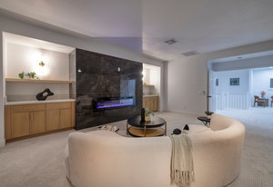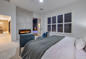 area. The first-floor primary suite feels like a private retreat, complete with patio access, linear fireplace, a