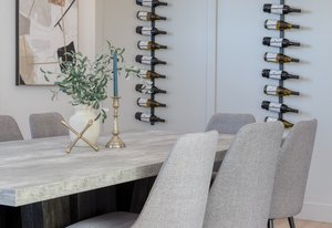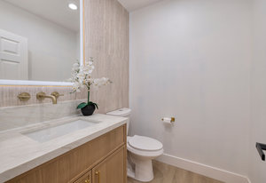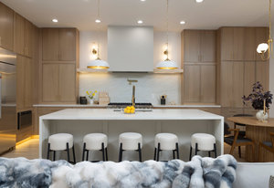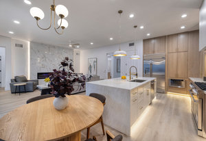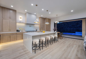 gorgeous Chef's kitchen features a waterfall island, custom cabinetry with LED lighting, full height