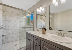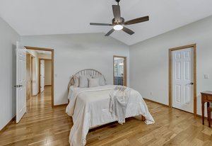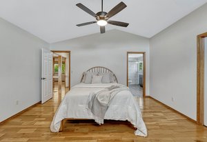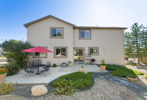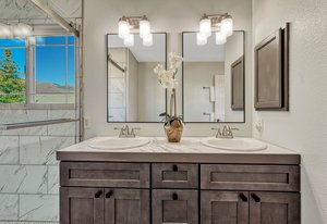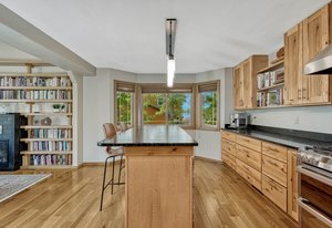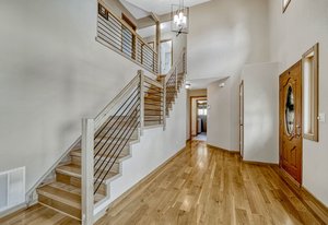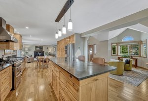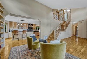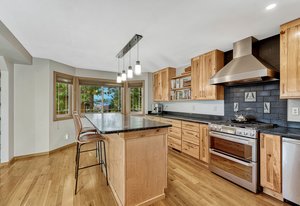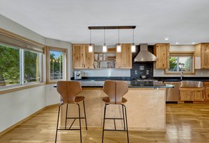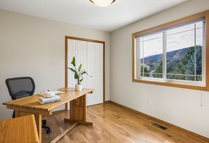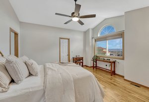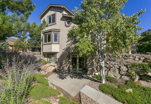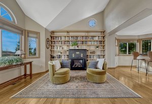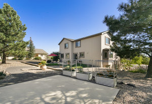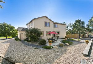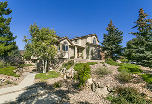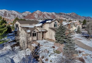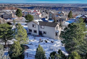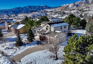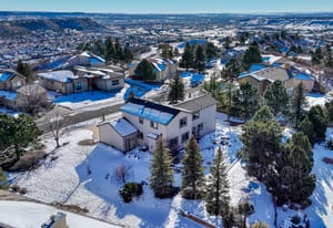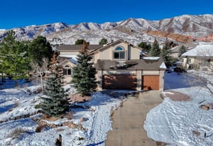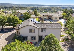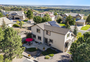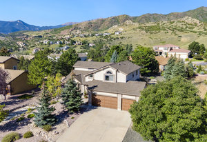 The One for Details. Mountain Shadows Living redefined with views from upstairs, privacy in the backyard, two fireplaces on the main level, a walkout basement and the quiet of a premier foothills cul-de-sac. Genuine white oak hardwoods grace the main and upper levels, with matching engineered planks on the stairs and basement, this residence is ideal for allergy-sensitive living as there is no carpet anywhere in the home. The open, re-imagined layout begins with a dramatic two-story entry and living room showcasing metal-rail stair design, soaring ceilings, and a soapstone-surround fireplace framed by custom prairie-art tile and floating shelves. The spectacular kitchen—transformed through wall removal for maximum openness—features hickory cabinetry, a two-tier soapstone island, LG stainless gas range with ducted hood, floating shelves, and coordinated soapstone accents. The adjacent family room centers on a second fireplace and flows naturally to a xeriscaped backyard with raised garden beds, stone-framed gas fire feature, and minimal water use for effortless outdoor enjoyment. Upstairs, the vaulted primary suite offers sweeping views of Ute Valley Park and sparkling evening city lights; its remodeled bath highlights a freestanding clawfoot tub and frameless glass shower with custom tile. Three secondary bedrooms share a full bath, each with unique perspectives—city lights, rock formations, or the shoulder of Pikes Peak. A bright walk-out basement adds a granite wet bar, guest suite, and recreation space. Paid-off solar panels ensure impressively low utility costs, while the stucco exterior and finished three-car garage with 200-amp service and dual 220 V outlets enhance function and longevity. Situated on a quiet hillside cleft, walking distance to Chipeta Elementary, and minutes from Garden of the Gods, Ute Valley Park, and the Air Force Academy, this home is where Colorado Craftsmanship, comfort, and sustainability meet. An elevated lifestyle awaits.