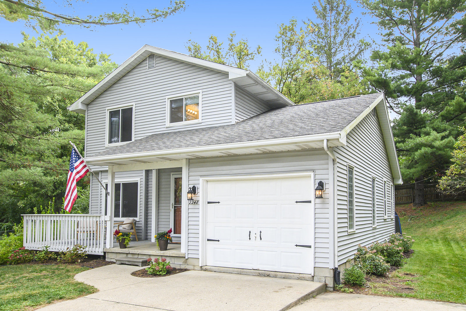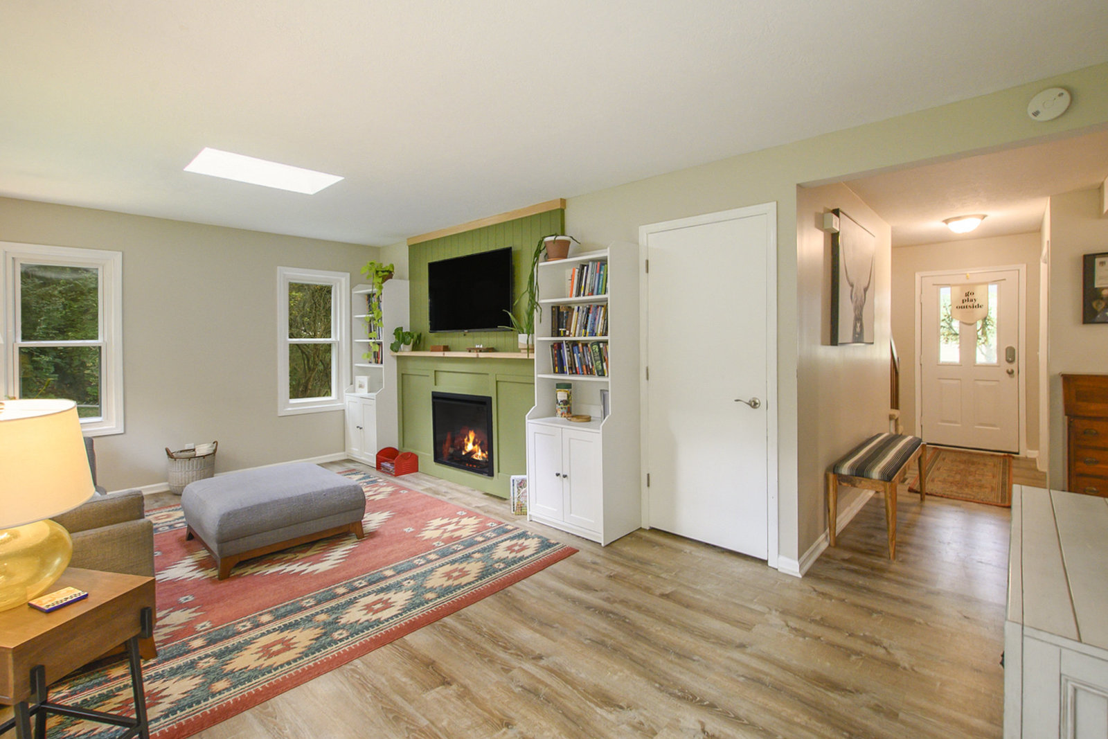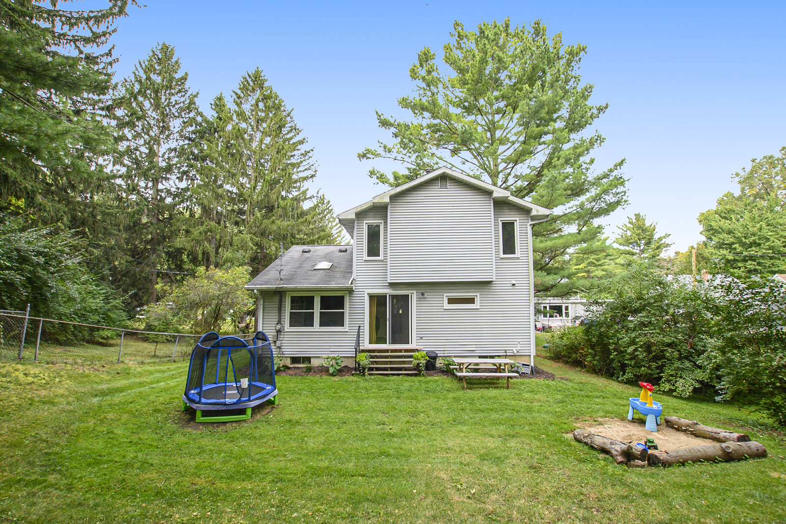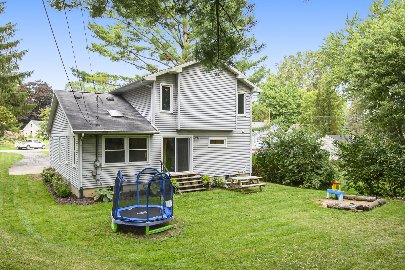 This 1,282 sq ft home offers comfort, character, and convenience—all within the sought-after Okemos Public School District. Step inside from the welcoming front porch into a bright and functional foyer, complete with a coat rack and shoe bench—perfect for Michigan seasons. The open-concept kitchen features a convenient breakfast bar and flows seamlessly into the dining area, ideal for both everyday living and entertaining. The cozy living room is filled with natural light from overhead skylights and features new built-ins, an electric fireplace, and a sliding door that leads to your private backyard. A stylish half bath completes the main floor. Upstairs, you'll find three comfortable bedrooms and a full bathroom. Outside you'll find a private backyard—perfect for play, entertaining, or relaxing evenings under the stars. Don't miss the opportunity to make this warm and welcoming home yours today!