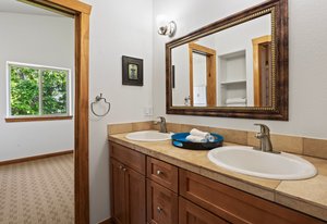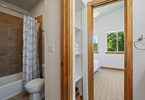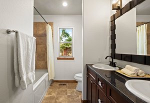 Upstairs, you’ll find three bedrooms—including two with ensuite baths—plus a convenient laundry area and a generous rooftop deck ideal for entertaining, relaxing, or stargazing. The primary suite includes a spacious walk-in closet, dual vanities, and a linen closet for added storage.