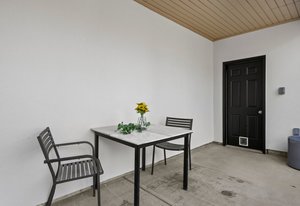 A welcoming covered front sitting area sets the tone for this home’s inviting character. Inside, a spacious foyer with gallery-style art walls flows seamlessly into the open living room with a cozy fireplace and the well-appointed kitchen. The kitchen boasts granite countertops, stainless steel appliances, and a bar-height counter—perfect for casual dining or entertaining. Designed for indoor-outdoor living, the kitchen opens directly to a private courtyard with a partially covered patio and garden space. The attached two-car garage connects effortlessly to this area, enhancing the home’s functional and thoughtful layout.