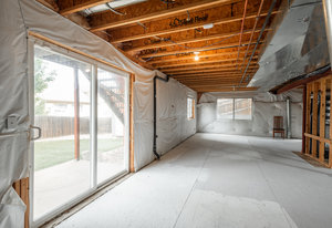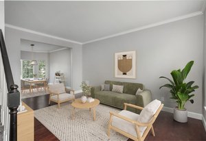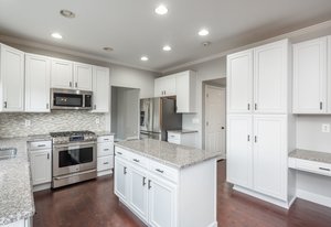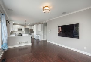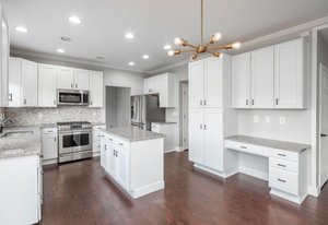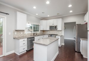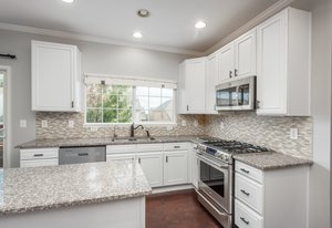 The beautifully updated kitchen features crisp white cabinets, a mosaic tile backsplash, stainless steel appliances, a kitchen island, and a cozy eat-in nook perfect for everyday meals. The adjoining living room showcases built-in shelving, a whitewashed fireplace, and surround sound throughout the home.