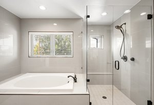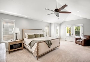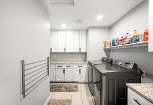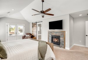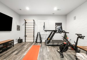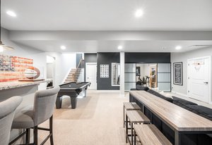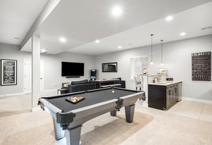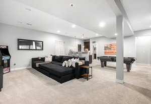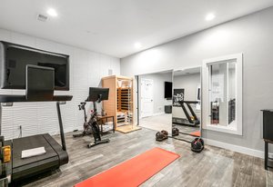 The finished lower level is designed for leisure, featuring a large recreation area with wet bar, a wine cellar, a home gym with infrared sauna, and an additional bedroom and bath.