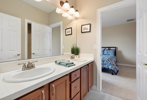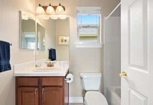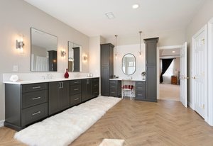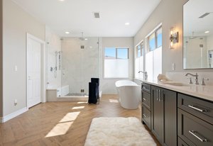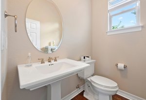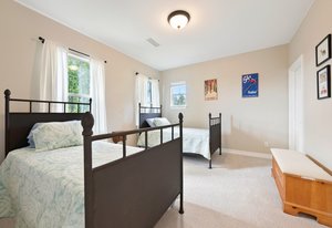 Upstairs, the primary suite is a peaceful retreat from the rest of the house. A cozy sitting area creates a sense of separation and calm, while the walk-in closet and recently redesigned bathroom elevate the experience. The spa-like bath, with its soaking tub, custom tile, and designer finishes, feels like a personal escape at the end of the day.
