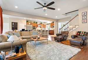 Just beyond, the home opens into spaces designed for both everyday living and memorable gatherings. A gracious dining room sets the stage for everything from intimate dinners to holiday celebrations, while a thoughtfully placed powder room adds convenience. The family room is truly the heart of the home, expansive and inviting, with a striking fireplace and large windows that fill the space with natural light.