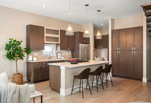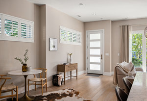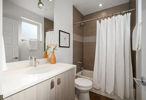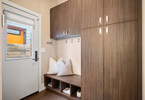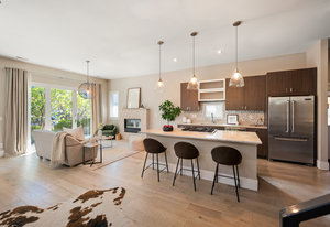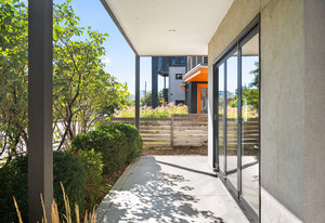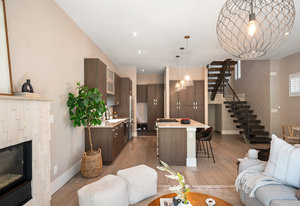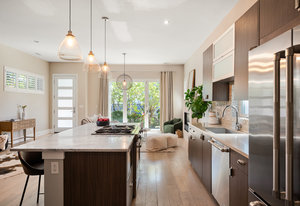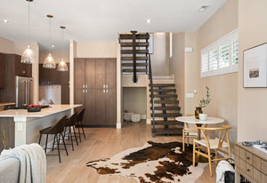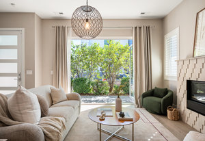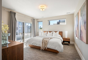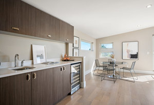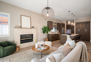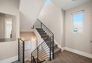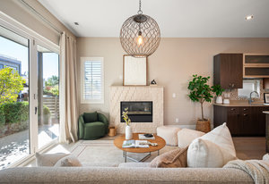 The open main level showcases high ceilings, hardwood floors, a sleek gas fireplace, and accordion-style glass doors that expands your living space to the the front patio. The chef’s kitchen offers high-end appliances, a Carrara marble island, custom cabinetry, breakfast bar, and pantry. A mudroom with storage and a nearby powder room complete the level.