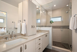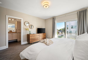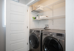 Upstairs, the primary retreat includes sliding glass doors to a private outdoor deck, a walk-in closet, and a spa-like bath with dual vanities and an oversized shower with dual rain heads. The second bedroom includes an en-suite bath, with laundry conveniently located on this bedroom level.