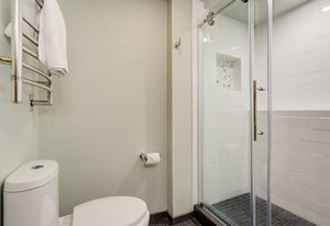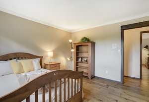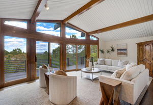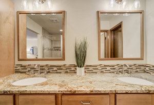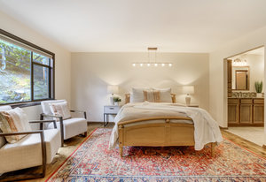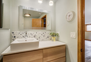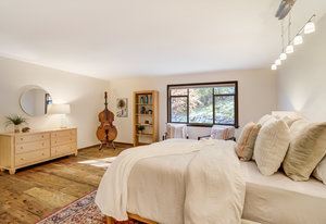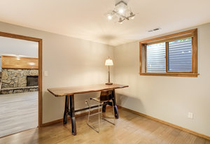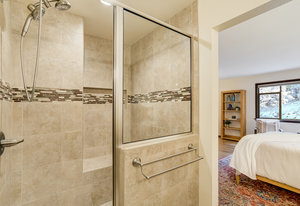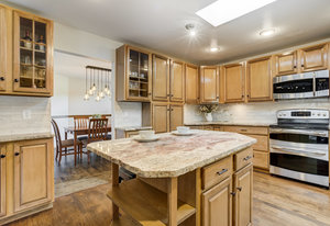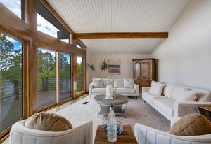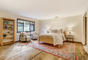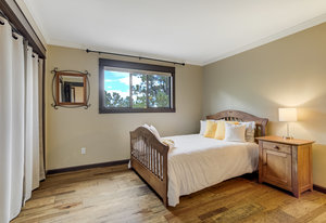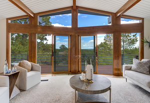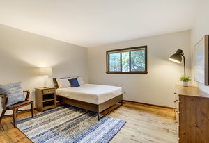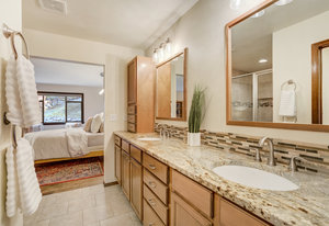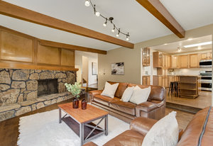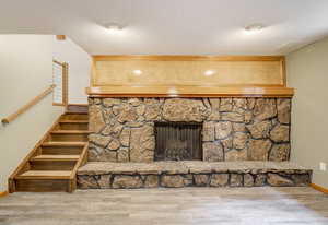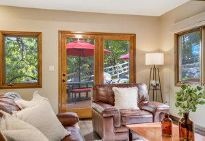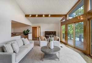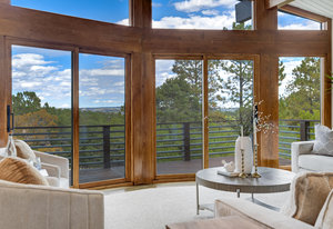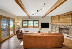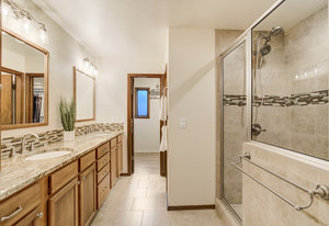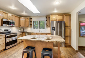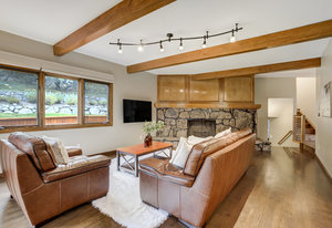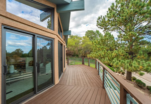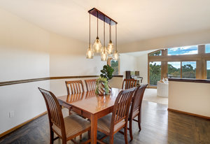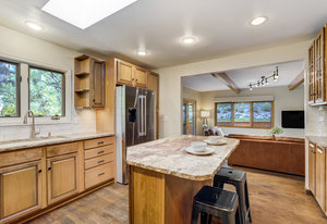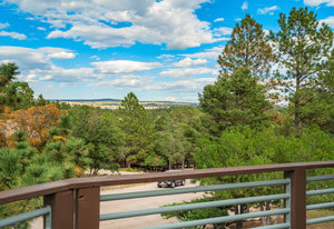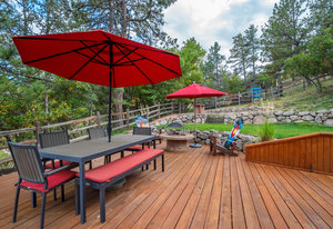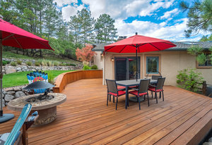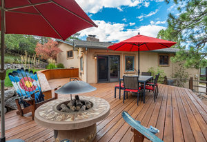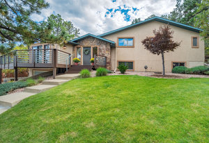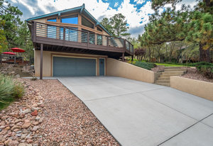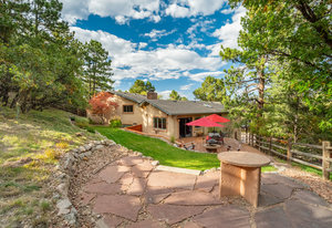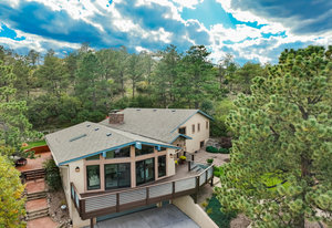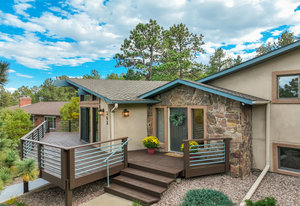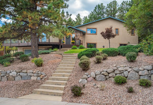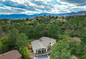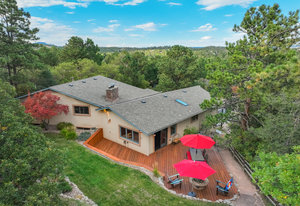 The One for Character. The prize of the 1976 Parade of Homes, elemental living abounds with a prow living room and sliders opening onto a full-span front deck with city light views. This five bedroom, 3 bath, 4-car garage home with 3400+ square feet on a 0.42 acre lot is brilliantly-positioned for life with large rooms, perfect outdoor living areas, updated bathrooms, and a spacious granite & maple kitchen. But this is just the beginning. Vaulted tongue-and-groove ceilings highlight the main level, where hardwood flooring extends through the entry, dining, kitchen, and family room. A full-wall moss rock fireplace and beamed ceilings bring warmth and distinction to the living room, complemented by an expansive rear deck of over 300 square feet overlooking forested hillside open space. The backyard offers just enough grass, a gas fireplace and grill line, and a fenced garden area. The island kitchen showcases rough-hewn granite slab counters, maple cabinetry, stainless steel Bosch and GE appliances, and a new tile backsplash. Upstairs, engineered hickory flooring connects three spacious bedrooms. The primary suite includes a walk-in closet, wooded views, double vanities with granite counters, and a spa-like tiled shower with bench and hand wand. A remodeled full bath serves the secondary bedrooms. On the lower level, another family room with LVT flooring, built-ins, and a second moss rock fireplace creates inviting flex space. Two additional bedrooms, a remodeled ¾ bath, and laundry complete the level. An oversized garage spans 37 x 40 feet for cars, storage, or workshop needs. With two furnaces, dual A/C units, Nest thermostats, and a location within casual Discovery at Rockrimmon, this home is minutes to Rockrimmon Elementary, local parks, and quick access to the United States Air Force Academy and downtown Colorado Springs. Your Comfortable Paradise Awaits.