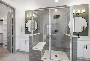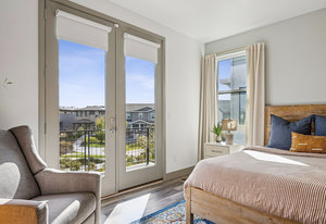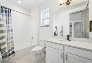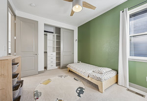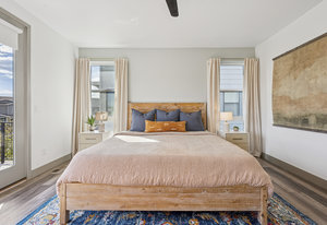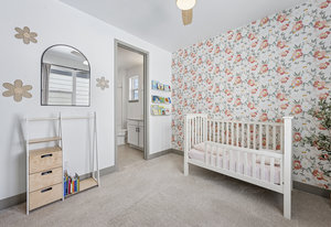 Upstairs, the primary suite provides a private retreat with a spa-style bath, dual vanities, custom tile shower with bench, walk-in closet, and a private balcony overlooking Lavender Park—a premium setting that distinguishes this home within the community. Secondary bedrooms are well-proportioned and connected by a Jack-and-Jill bath, offering flexibility for family, guests, or work-from-home needs.