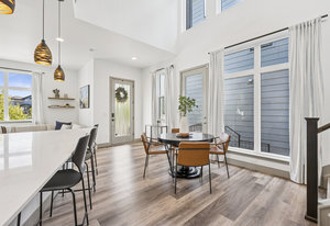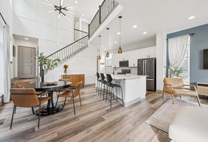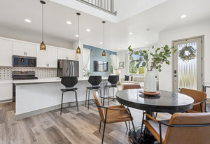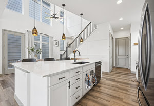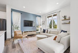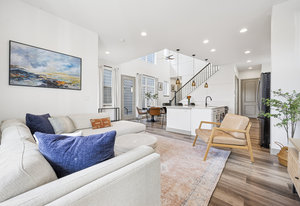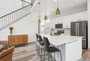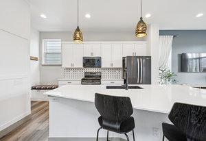 The open-concept main level features 10-foot ceilings, abundant natural light, and an efficient layout that prioritizes usable living areas. The kitchen anchors the space with quartz countertops, stainless steel appliances, gas cooktop and oven, oversized island, pantry, and designer lighting, ideal for both everyday living and entertaining.