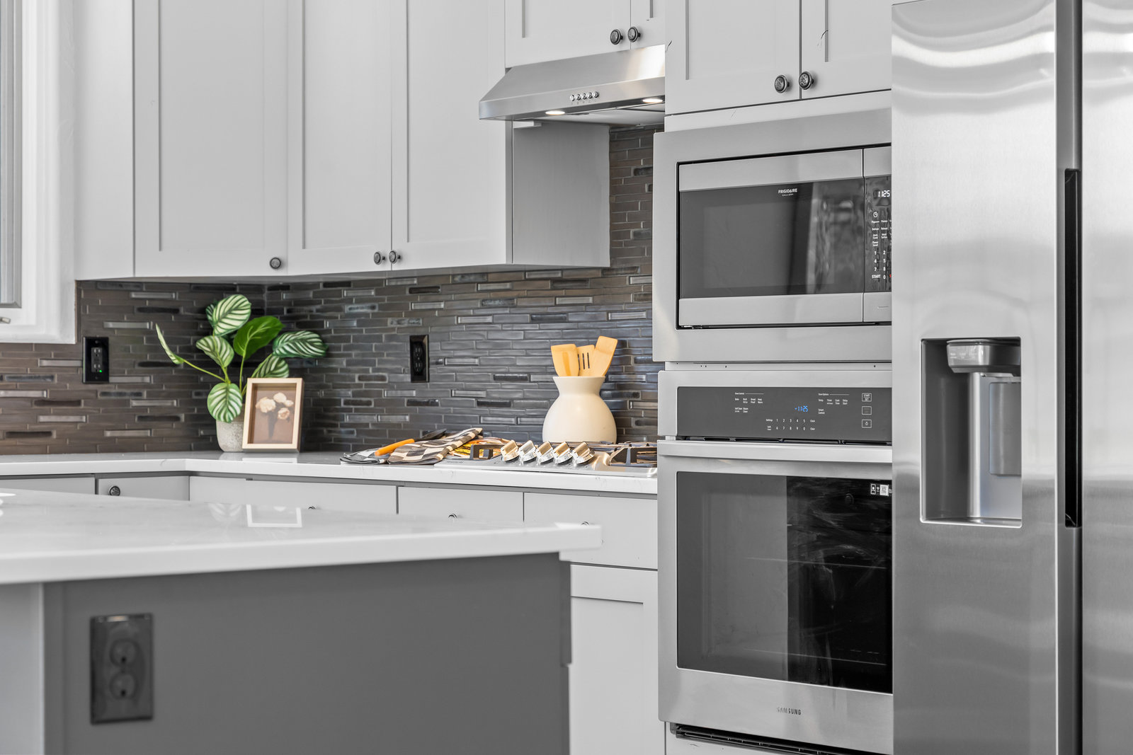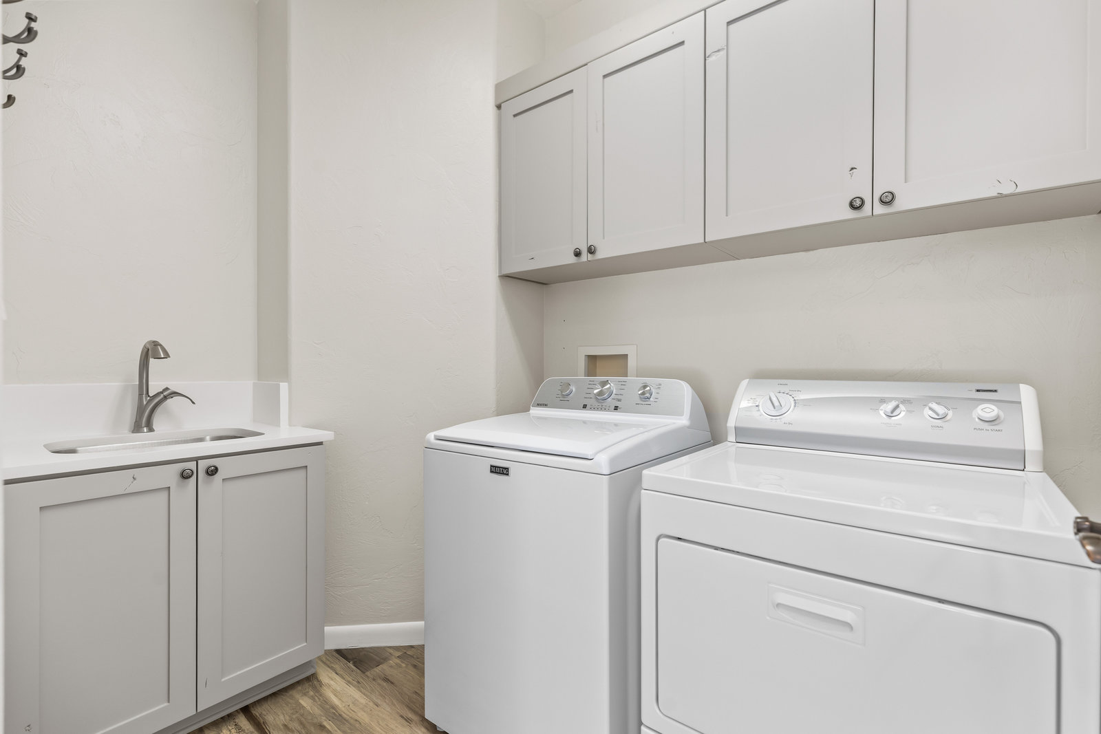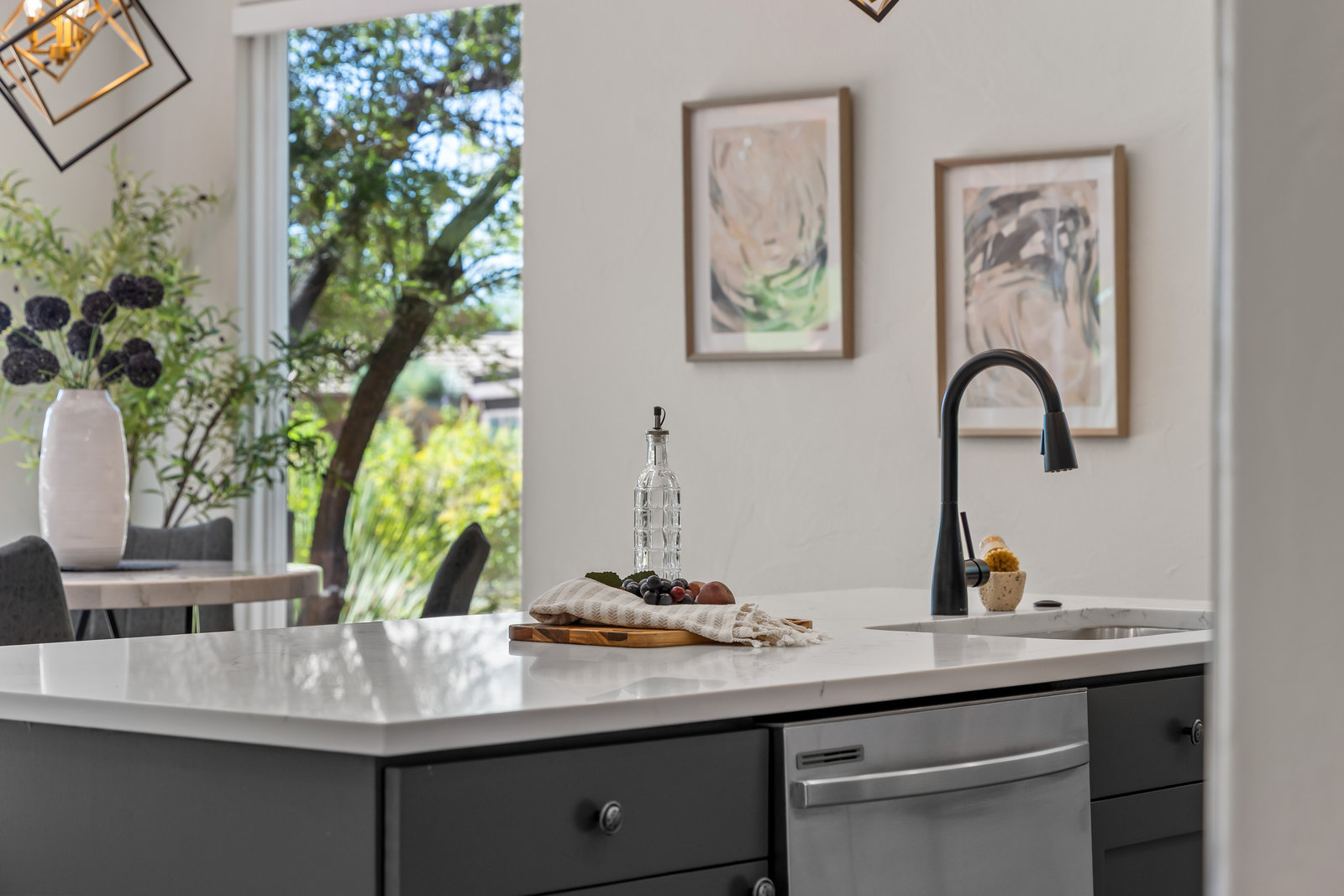 Set along the backdrop of bubbling creek, and beautiful fountain pond in the Entrada’s championship golf course country club, this beautifully remodeled home in Paiute Springs offers modern comfort and a resort-style ambience. A welcoming courtyard, highlighted by a striking glass-and-wood front door, opens to bright, open-concept living and kitchen spaces featuring beautiful LVP floors throughout. The kitchen is a showpiece with an oversized island, custom painted wood cabinets, tile backsplash, and modern light fixtures perfect for entertaining.