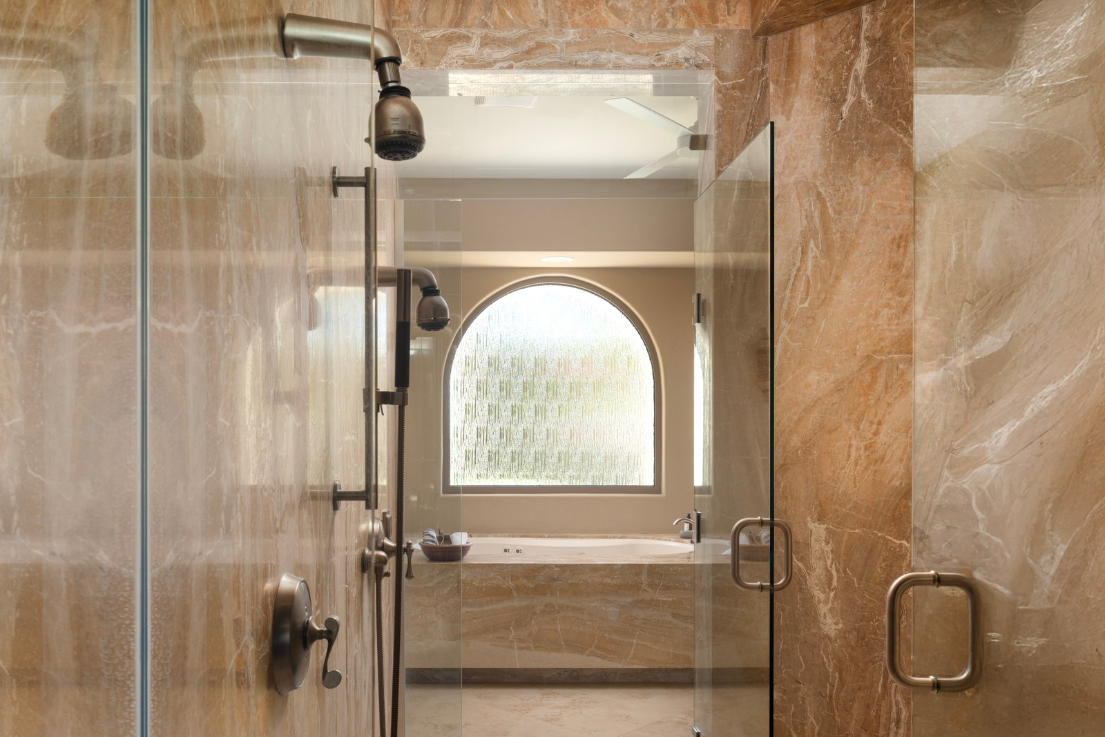 The primary suite occupies its own wing, complete with sitting room, double-sided fireplace, and dual spa-style baths, with two large walk-in dressing rooms, double steam shower and jetted tub. Massive windows on both sides of the suite frame mountain views in every direction.
