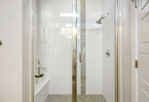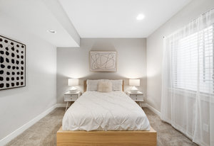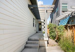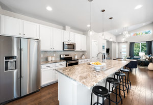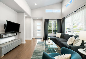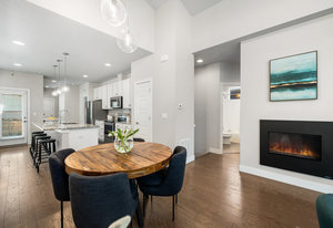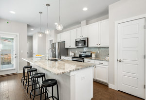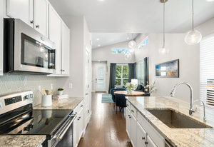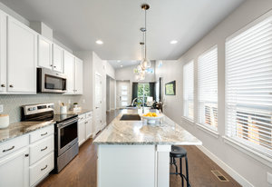 From the inviting front porch, step inside to soaring ceilings and walls of stacked windows that flood the open-concept main level with natural light. Wide-plank oak floors flow through the spacious living room and kitchen, vaulted dining area, and chef’s kitchen with updated West Elm light fixtures. Designed with beautiful white cabinetry, stainless steel appliances, oversized granite island, and direct access to the back patio, this kitchen is an entertainer’s dream come true.