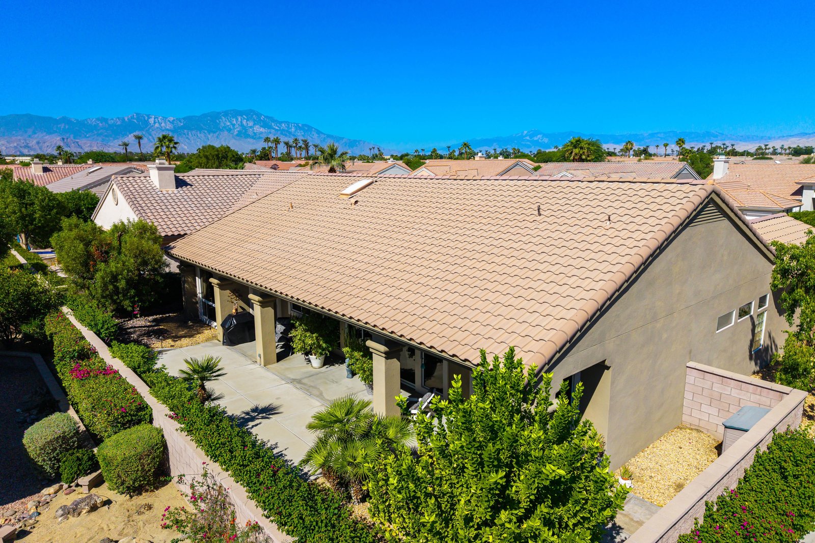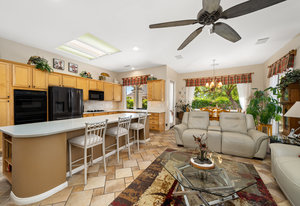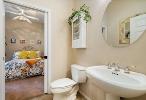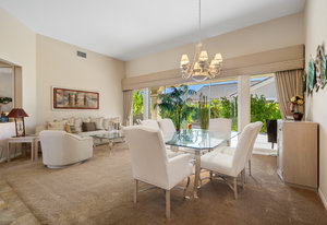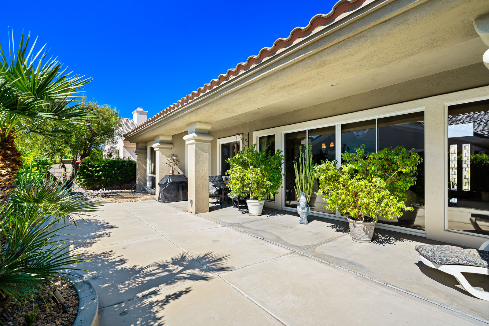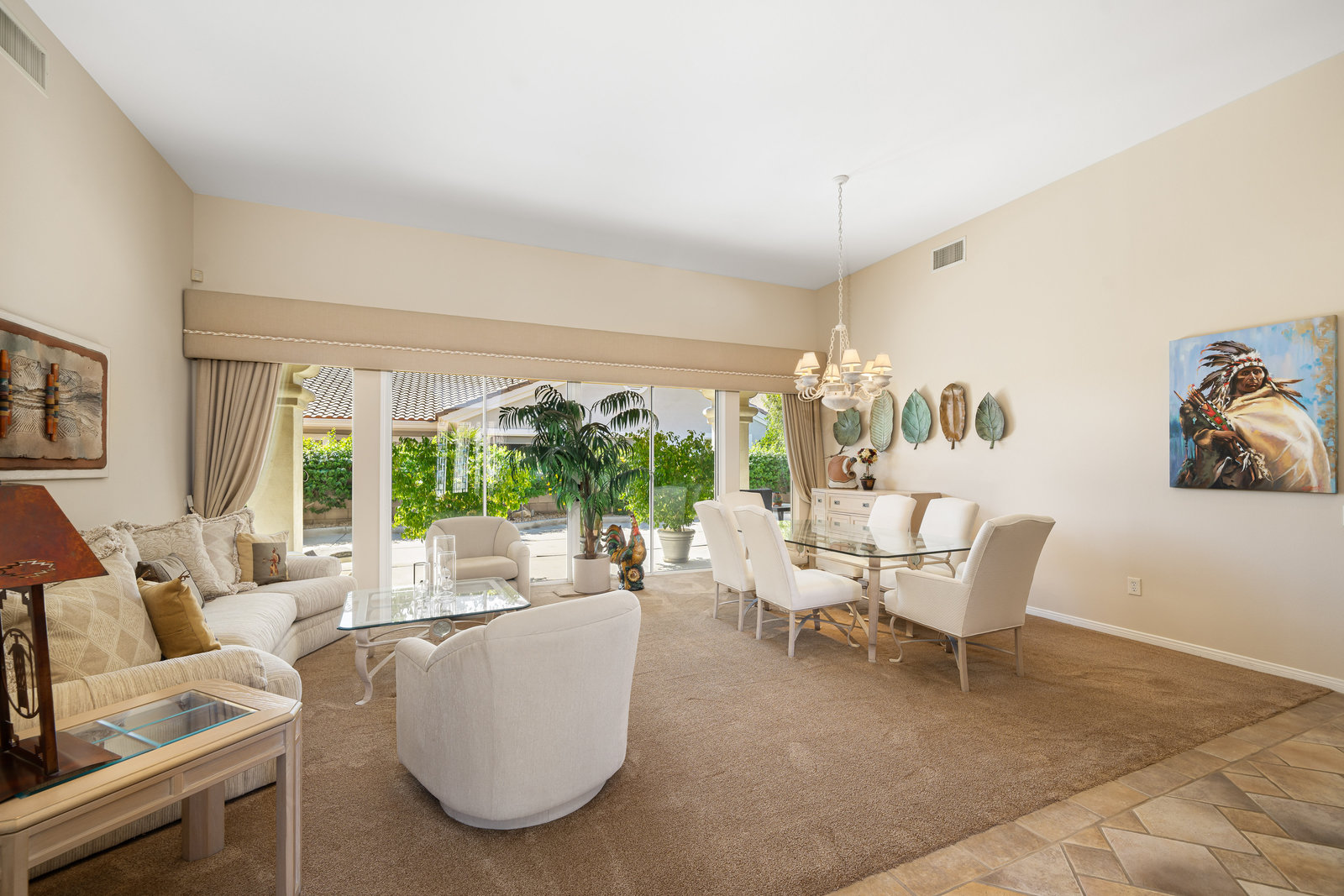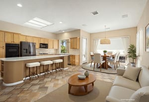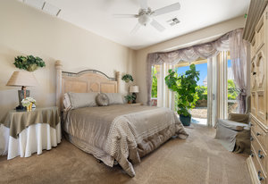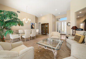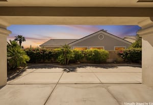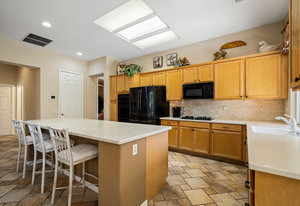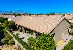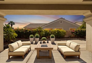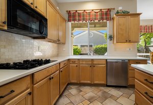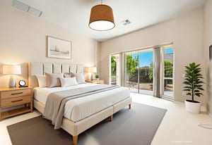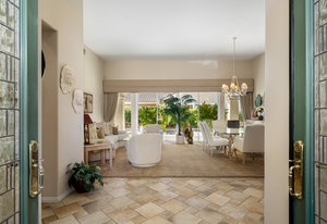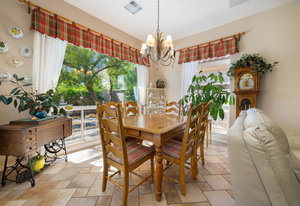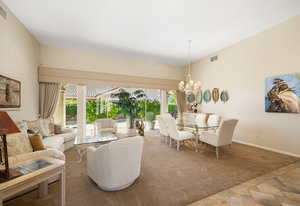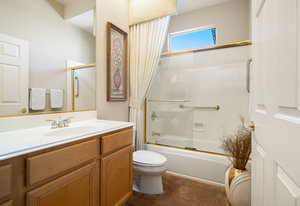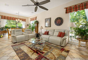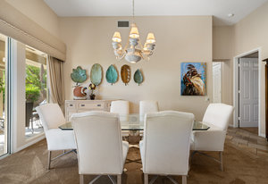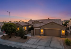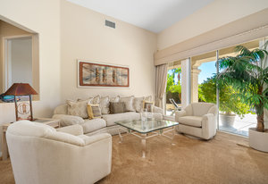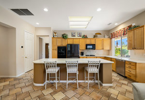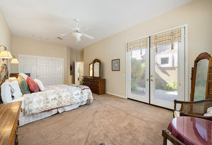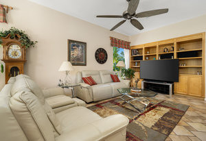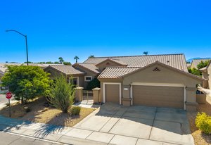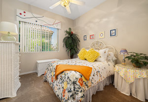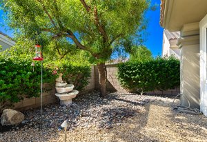 Light, bright and airy, the Monaco is one of the most desirable floor plans in Sun City offering open concept living, privacy between guest bedrooms and flexibility of space. This home sits on a corner lot on the end of a quiet street with an extended backyard. As you enter you are greeted by 10 and 12 ft high ceilings and glass sliders offering streams of natural light. The open kitchen has a dual oven with separate microwave. A generous sized island, makes cooking and entertaining a breeze. The main bedroom has an ensuite bathroom with a soaking tub, dual vanities, and a walk-in shower. The walk-in closet offers custom built-in organization. The over-sized guest bedroom with bath ensuite acts as an attached casita with its own separate entrance via glass french doors from the courtyard. The third bedroom could be used as flex space for use as a bedroom, office or den. All bedrooms have bathrooms ensuite. Step outside to the beautifully landscaped backyard. The extended patio offers fruit shade trees and lush landscaping. Enjoy your morning coffee under blue skies in your peaceful private backyard. The 2 car garage + golf cart space has a custom tool/workspace area and an abundance of storage options. Located near shopping, dining and top medical centers, Sun City is a 55+ community with two golf courses, tennis, pickleball and bocce courts, 3 clubhouses and two fitness centers. Furnishings are available outside of escrow.