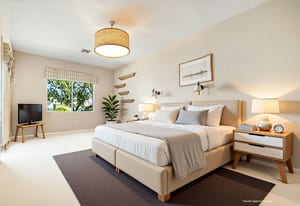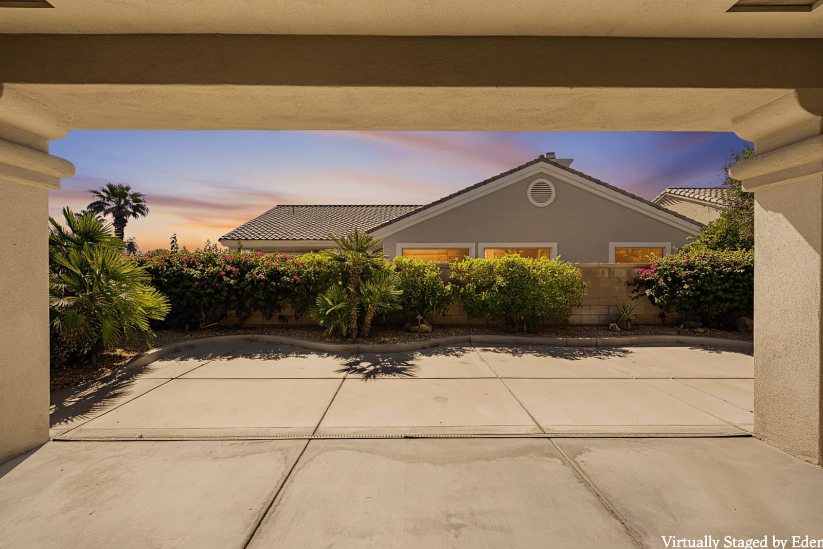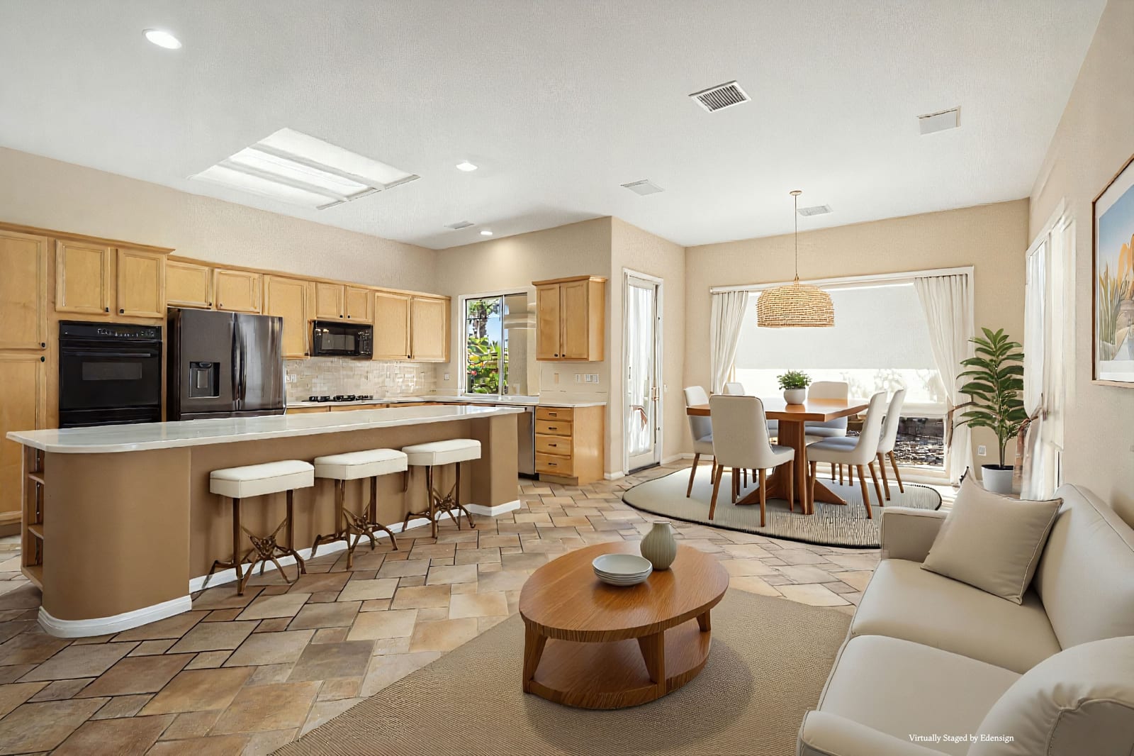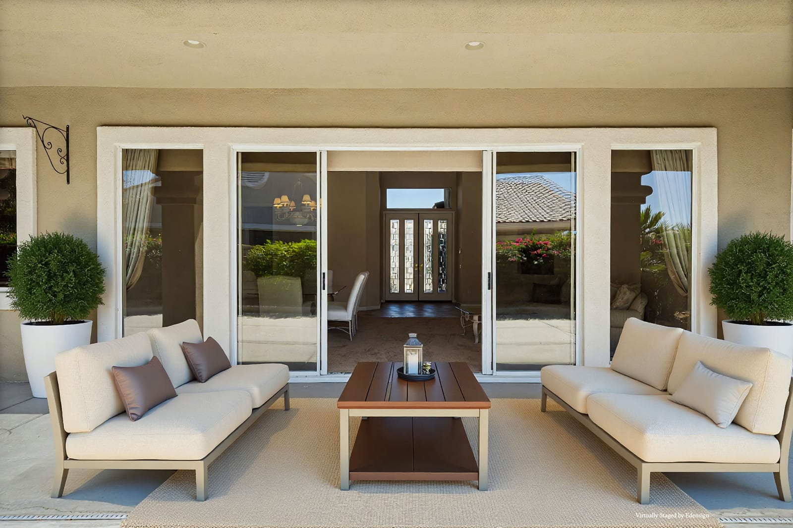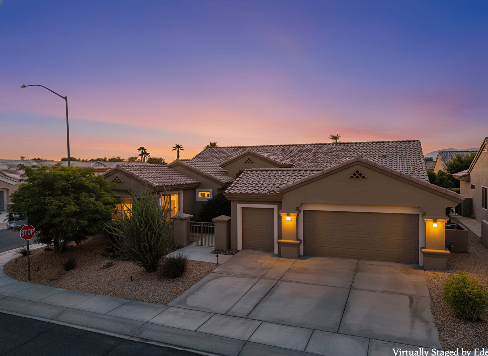 Light, bright and airy, the Monaco is one of the most desirable floor plans in Sun City offering open concept living, privacy between guest bedrooms and flexibility of space. This home sits on a corner lot on the end of a quiet street with an extended backyard. As you enter you are greeted by 10 and 12 ft high ceilings and glass sliders offering streams of natural light. The open kitchen has a dual oven with separate microwave. A generous sized island, makes cooking and entertaining a breeze. The main bedroom has an ensuite bathroom with a soaking tub, dual vanities, and a walk-in shower. The walk-in closet offers custom built-in organization. The over-sized guest bedroom with bath ensuite acts as an attached casita with its own separate entrance via glass french doors from the courtyard. The third bedroom could be used as flex space for use as a bedroom, office or den. All bedrooms have bathrooms ensuite. Step outside to the beautifully landscaped backyard. The extended patio offers fruit shade trees and lush landscaping. Enjoy your morning coffee under blue skies in your peaceful private backyard. The 2 car garage + golf cart space has a custom tool/workspace area and an abundance of storage options. Located near shopping, dining and top medical centers, Sun City is a 55+ community with two golf courses, tennis, pickleball and bocce courts, 3 clubhouses and two fitness centers. Furnishings are available outside of escrow.
