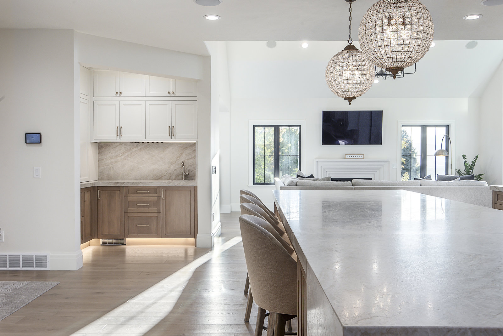 Inside, the home showcases a brand-new custom dream kitchen by Selah Cabinets, featuring high-end appliances, including a full-size SKS side-by-side refrigerator and freezer with a built-in water dispenser. The stunning Taj Mahal stone countertops and backsplash elevate the space, complemented by fully customized cabinetry designed for exceptional organization — with hidden trash bins, built-in spice racks, baking sheet dividers, and more. Additional highlights include a Ruvati workstation sink, double dishwashers, and a butler’s pantry with appliance garages, an in-cabinet ice maker, and thoughtfully placed accent lighting and outlets throughout.