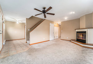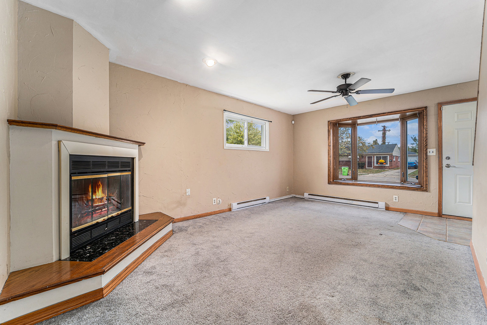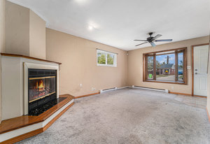 Spacious Living Room with cozy fireplace & bay window