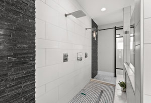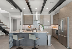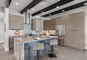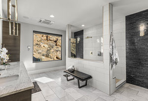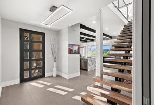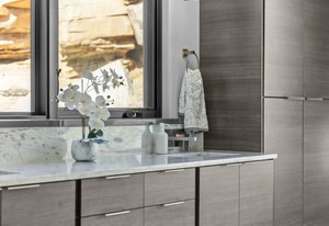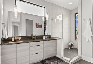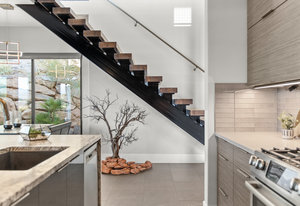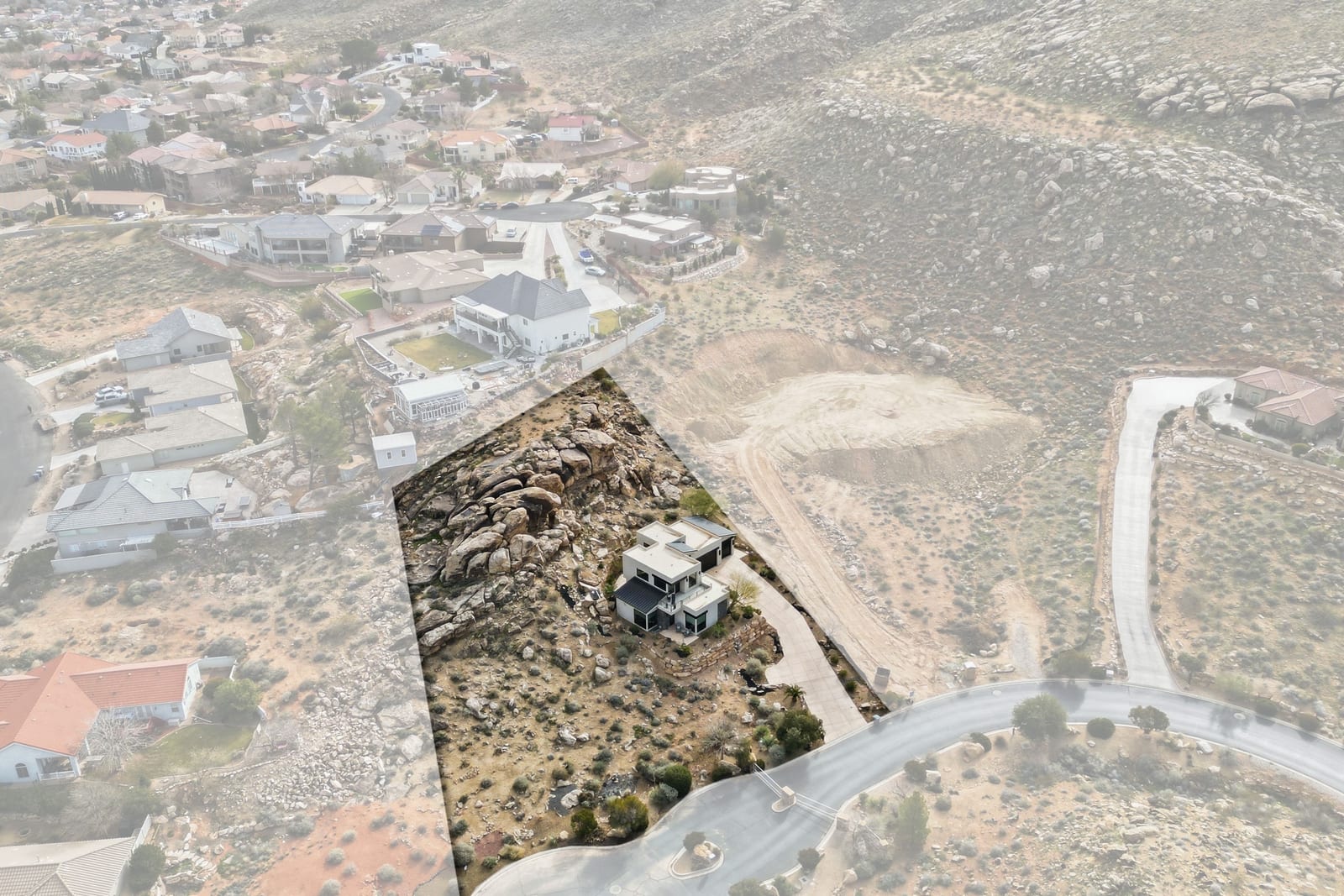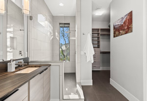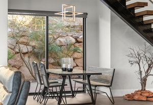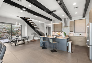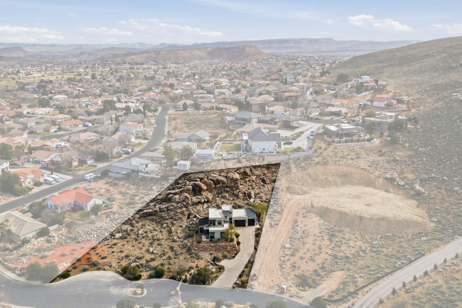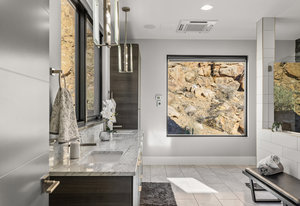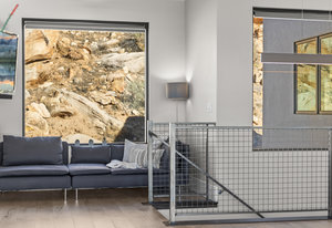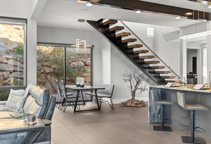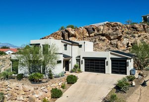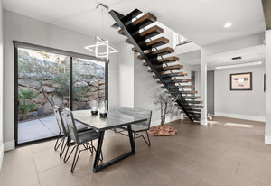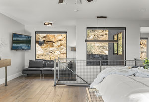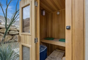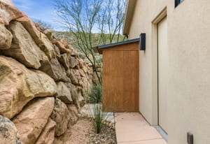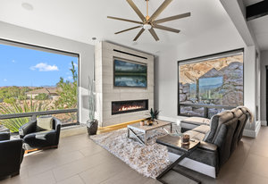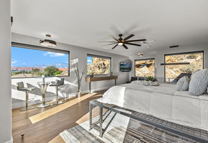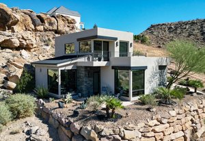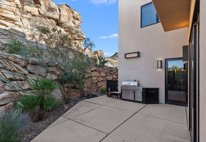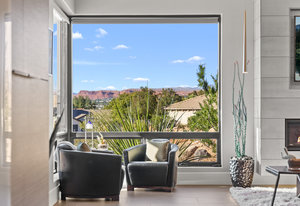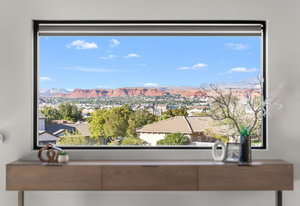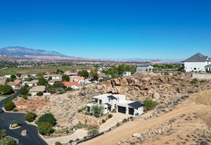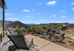 Experience modern luxury in this custom designed masterpiece by Wayne Andersen Custom Homes, nestled on a rare 1.02 acre lot with jaw dropping views of Pine Valley, Red Mtn and Snow Canyon. Ancient Indian Petroglyphs on the rock formations behind the home located on the property . Step through the steel and glass front door into a light filled interior boasting large format porcelain tile, expansive metal-framed windows that capture the stunning surroundings, and a floating wood and metal staircase. Built with quality and longevity in mind, this home features 2x6 construction and blown-in insulation, ensuring enhanced energy efficiency and year round comfort. The kitchen impresses with high-end Bosch appliances including a microwave drawer, refrigerator, a waterfall-edge Bianco Antico granite island, Arctic White quartz countertops, gray glass subway tile backsplash, and rich horizontal-grain cabinetry. Overhead, open steel beams lend a modern yet warm aesthetic. The open concept living area features a contemporary tile gas fireplace, a recessed TV niche, and is wired for sound with indoor and outdoor speakers perfect for entertaining or relaxing to your favorite music. Even better, all audio equipment is included, offering a truly turnkey experience for media lovers. The primary suite is a private sanctuary, thoughtfully designed to maximize the stunning views of Pine Valley, Red Mtns, Snow Canyon and natural boulders. Enjoy the private patio to enjoy coffee at sunrise or unwind under the stars. Inside, the suite showcases premium finishes and modern touches, including a custom walk-in closet with built-in drawers and shelving for effortless organization. The spa-inspired en suite bathroom features a sleek double sink vanity, designer fixtures, and a luxurious walk-through shower with dual shower heads offering both elegance and functionality. The guest en-suite also includes a spa-like bathroom with double sink vanity, walk-in shower, built-in closet shelving. Outside, the xeriscaped backyard is an entertainer's dream, featuring a custom sauna, a built-in Char-Broil BBQ, a cozy fire pit, and solar-powered landscape lighting. Relax and explore your private outdoor space with natural boulders and red rock cliffs as your backdrop. The oversized garage features epoxy-coated floors, Martin tinted glass & metal doors, and extra-tall ceilings perfect for storing recreational equipment, vehicles, or setting up a workshop.