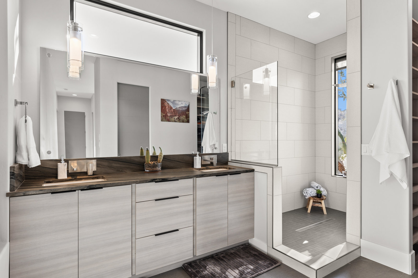 Experience modern luxury in this custom-designed masterpiece by Wayne Andersen Custom Homes, nestled on a rare 1.02-acre lot with jaw-dropping mountain views and direct access to ancient Indian petroglyphs etched into the natural rock formations behind the home—right on your property. Step through the dramatic steel-and-glass front door into a light-filled interior boasting large format porcelain tile, expansive metal-framed windows that capture the stunning surroundings, and a floating wood and metal staircase. Built with quality and longevity in mind, this home features 2x6 construction and blown-in insulation, ensuring enhanced energy efficiency and year-round comfort. The chef’s kitchen impresses with high-end Bosch appliances (including a microwave drawer and refrigerator), a waterfall-edge Bianco Antico granite island, Arctic White quartz countertops, gray glass subway tile backsplash, and rich horizontal-grain cabinetry. Overhead, open beams and sleek steel elements lend a modern yet warm aesthetic. The open-concept living area features a contemporary tile gas fireplace, a recessed TV niche, and is wired for sound with indoor and outdoor speakers—perfect for entertaining or relaxing to your favorite music. Even better, all audio equipment is included, offering a truly turnkey experience for media lovers. The primary suite is a private sanctuary, thoughtfully designed to maximize comfort, style, and connection to the stunning natural landscape. Wake up each morning to panoramic views of dramatic red rock formations and surrounding mountains, visible through expansive windows and from your spacious private patio—the perfect spot to enjoy coffee at sunrise or unwind under the stars. Inside, the suite showcases premium finishes and modern touches, including a custom walk-in closet with built-in drawers and shelving for effortless organization. The spa-inspired en suite bathroom features a sleek double sink vanity, designer fixtures, and a luxurious walk-through shower with dual shower-heads—offering both elegance and functionality. The guest en-suite also includes a spa-like bathroom with double sink vanity, walk-in shower, built-in closet shelving, and stunning views from the room. Outside, the xeriscaped backyard is an entertainer’s dream, featuring a custom sauna, a built-in Char-Broil BBQ, a cozy fire pit, and solar-powered landscape lighting. Relax and explore your private outdoor space with natural boulders and red rock cliffs as your backdrop. The oversized garage features epoxy-coated floors, tinted glass & metal doors, and extra-tall ceilings—perfect for storing recreational equipment, vehicles, or setting up a workshop.