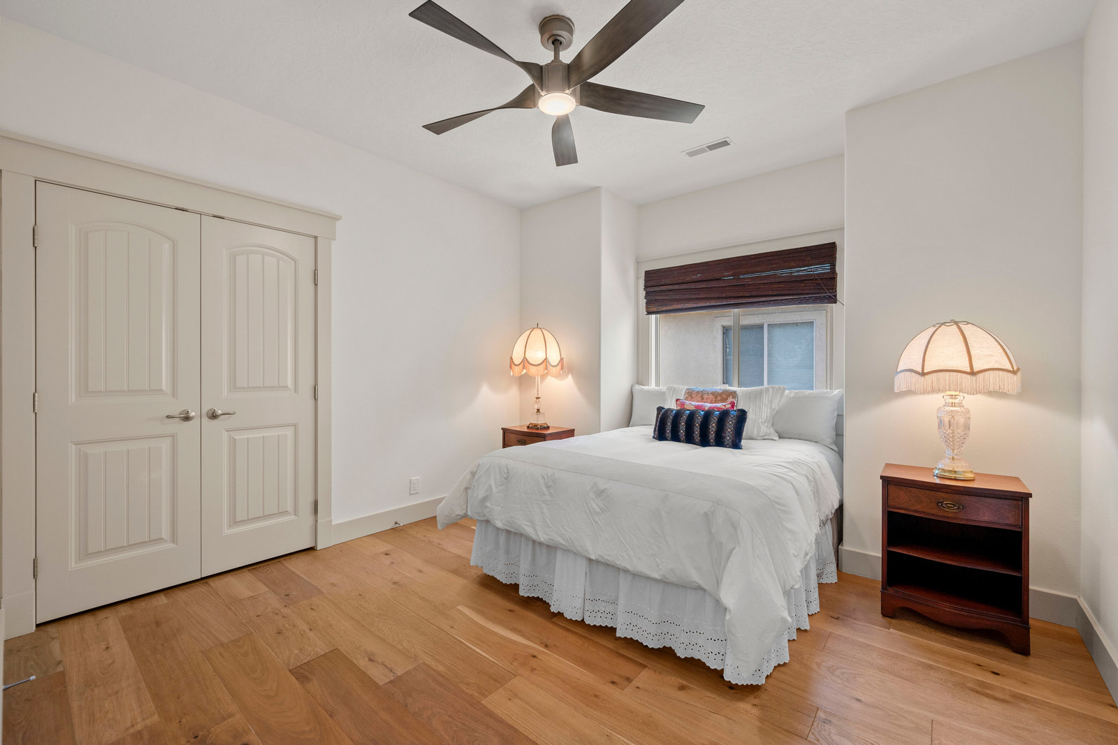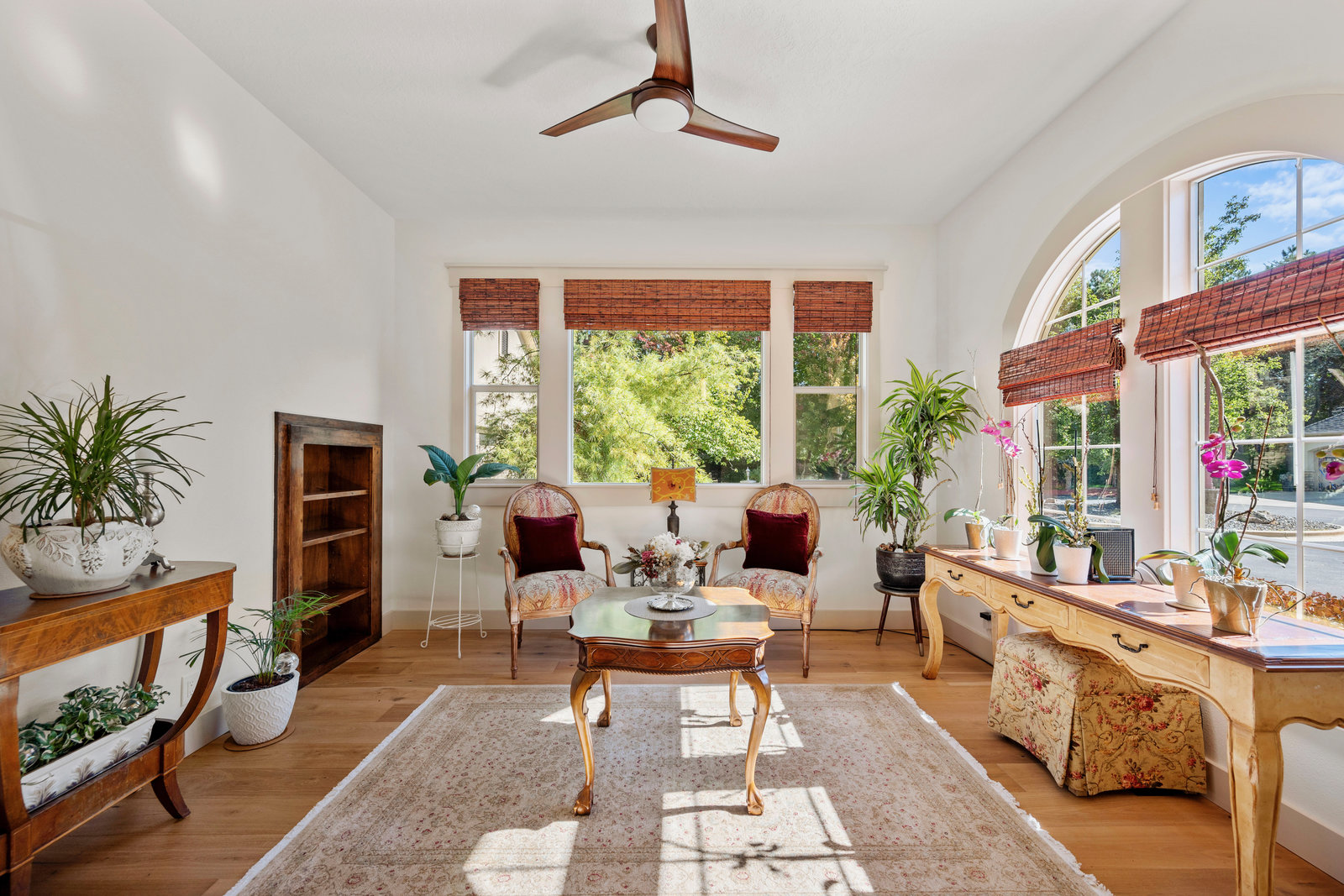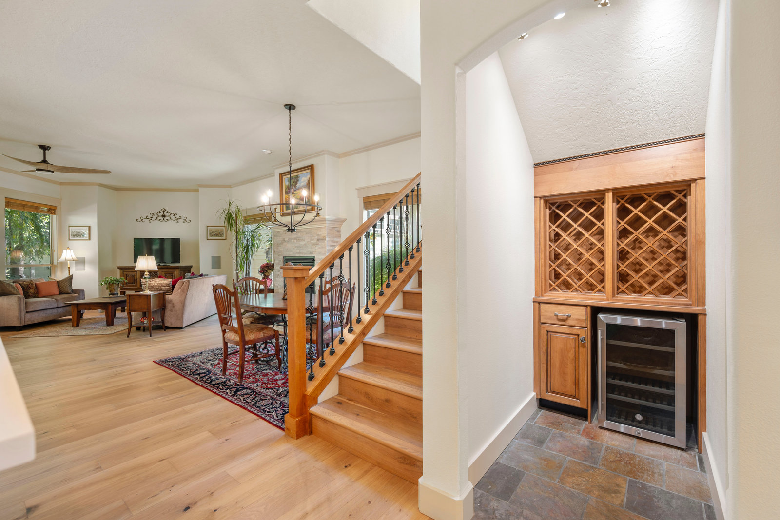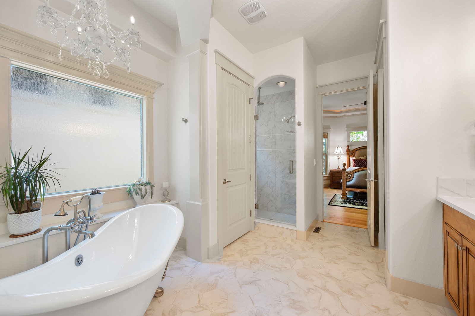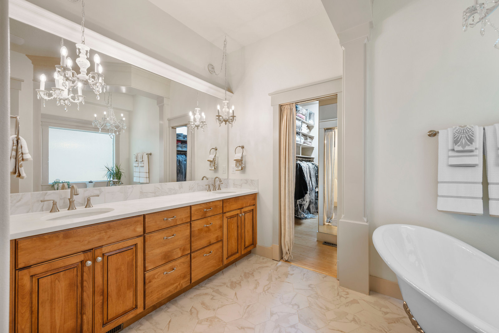 The open kitchen, complete with island, wine area, and wine fridge, creates a welcoming space for relaxed entertaining or quiet evenings in. The main-level primary suite is a sanctuary featuring a walk-in shower, cast iron clawfoot tub, dual-sink vanity, and dual closets.