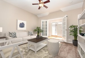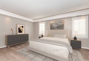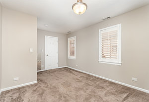Elegant white plantation shutters frame each window, offering refined style and light control. Rich oak hardwood floors add warmth and character throughout.