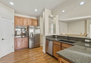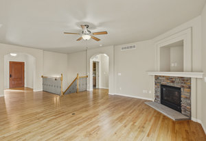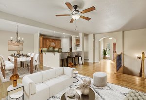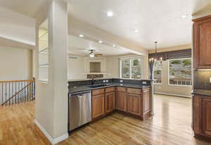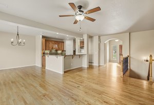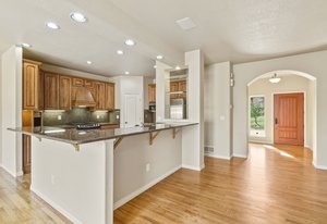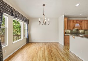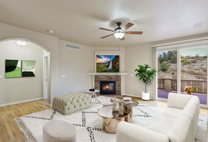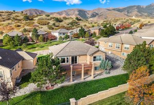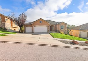 Welcome home to this beautifully appointed ranch-style retreat offering four bedrooms, three bathrooms, and breathtaking views from every angle. The inviting kitchen features gleaming hardwood floors, granite countertops, stainless steel appliances including a gas range, a walk-in pantry, and an adjoining dining space perfect for everyday living or entertaining. The open-concept family room showcases a cozy gas fireplace, hardwood flooring, and seamless flow to the dining nook. The main-level primary suite is a true haven with a luxurious 5-piece bath featuring a walk-in shower and jetted soaking tub. Step out from the main level to the enclosed composite deck and take in the serene scenery of the bluff directly behind the home. A main-level office provides the perfect space for the stay-at-home professional. Downstairs, the finished walk-out basement offers three spacious bedrooms, a full bath, and a large recreation room with a wet bar, ideal for entertaining or movie nights. Walk out to the lower patio and enjoy the private backyard surrounded by natural beauty. Located in the highly desired Peregrine neighborhood, this home is within the award-winning Academy District 20 schools and just a short drive to the Air Force Academy, shopping, restaurants, and entertainment. Experience the perfect blend of comfort, elegance, and Colorado living at its finest.