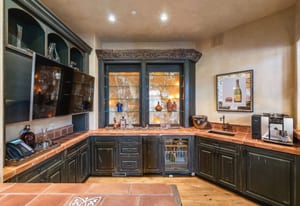 The chef’s kitchen is the heart of the home, featuring dual islands with seating for six, slab stone countertops, custom cabinetry, Wolf 6-burner range with griddle and pot filler, SubZero refrigeration with additional drawers, two dishwashers, warming drawer, and walk-in pantry. Breakfast and hearth rooms overlook the grounds. The two-story family room showcases a stone fireplace, floor-to-ceiling windows with French doors opening to terraces & gas fire pit. A statement bar with backlit slab detail, ice maker & more enhances the entertainer’s appeal. Formal living and dining rooms, butler’s pantry, wine room, private office with fireplace, guest suite, mudroom and powder baths complete the main level.