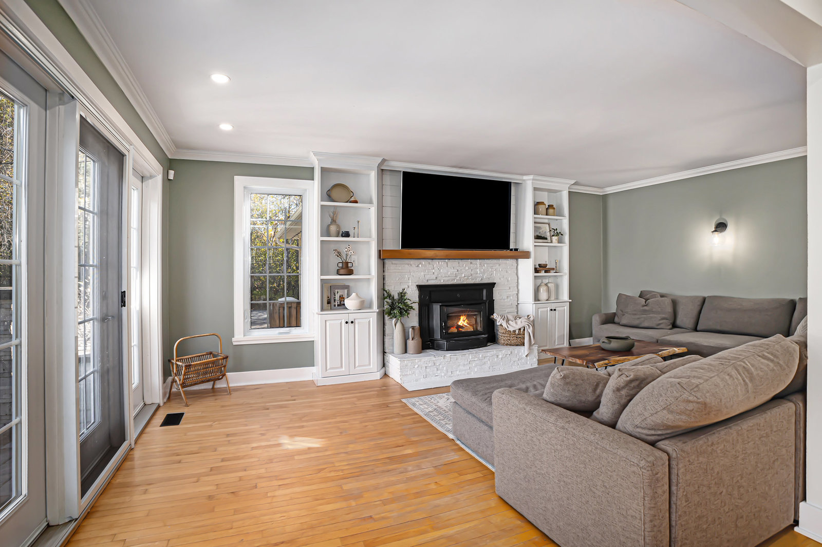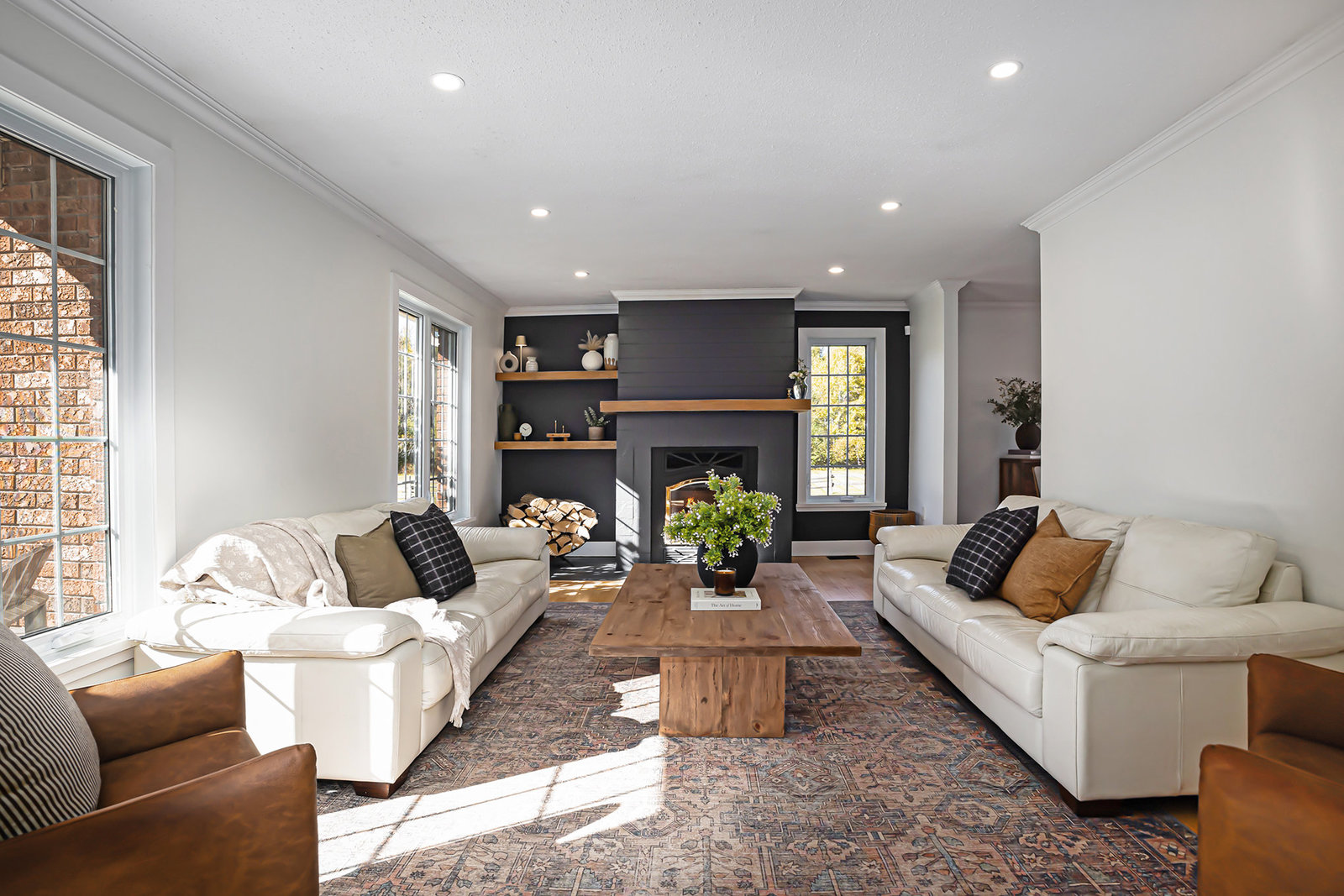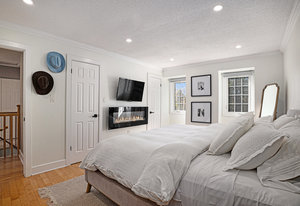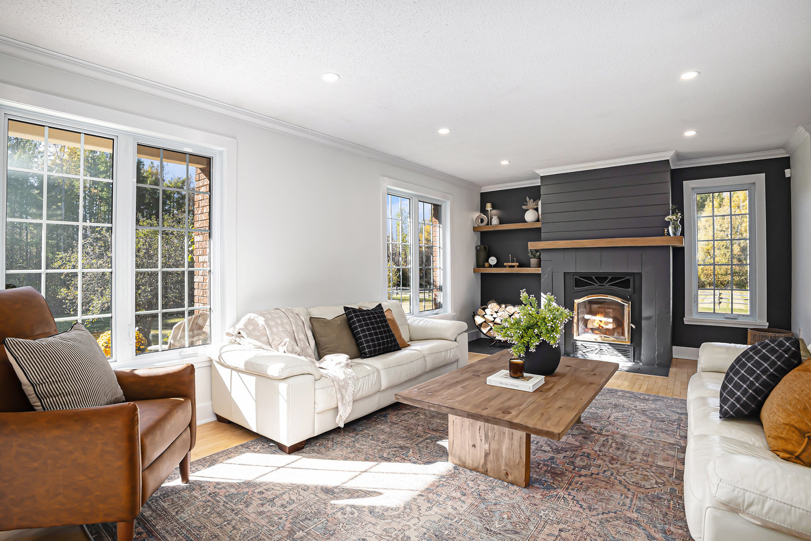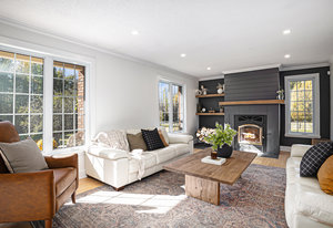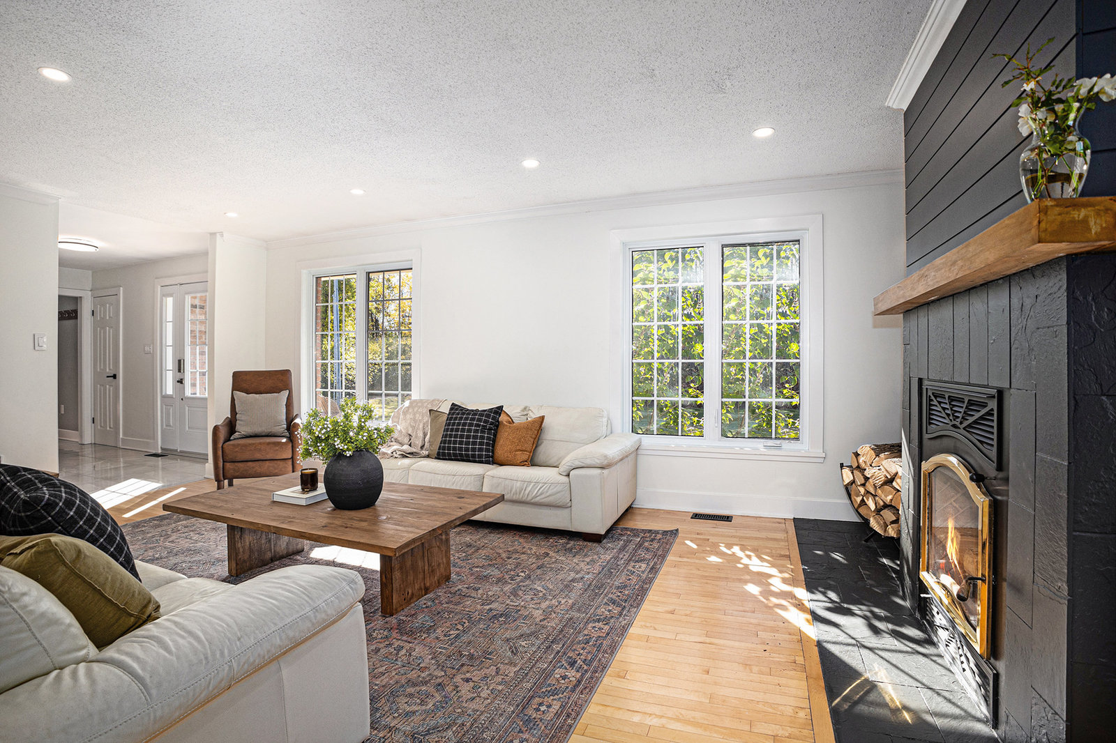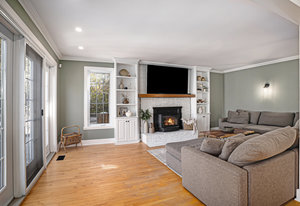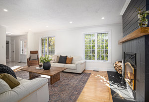 Inside, the main level showcases an open and inviting layout. The spacious living room is anchored by a warm wood-burning fireplace, perfect for cozy evenings, while the adjacent bright family room, also featuring a wood fireplace, serves as an ideal space for entertaining guests or relaxing with family. Oversized windows throughout flood the interior with abundant natural light, creating a cheerful and airy atmosphere and highlighting the rich hardwood flooring that runs seamlessly throughout the main and second floors.