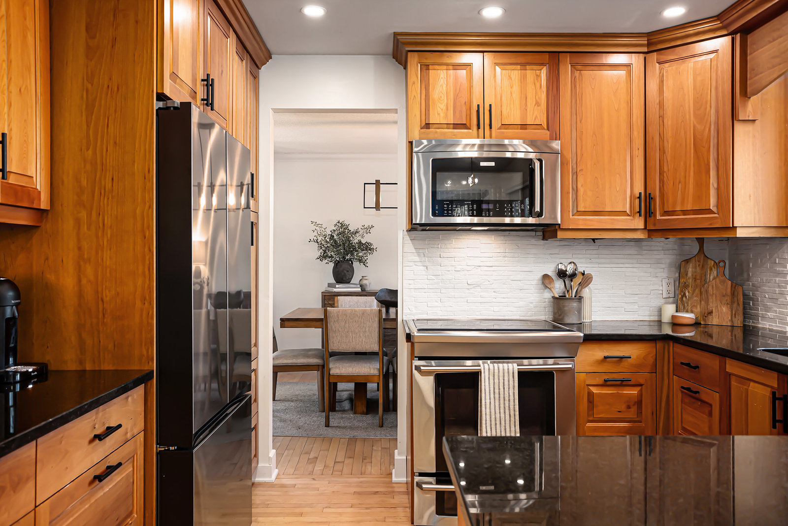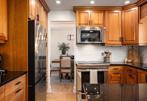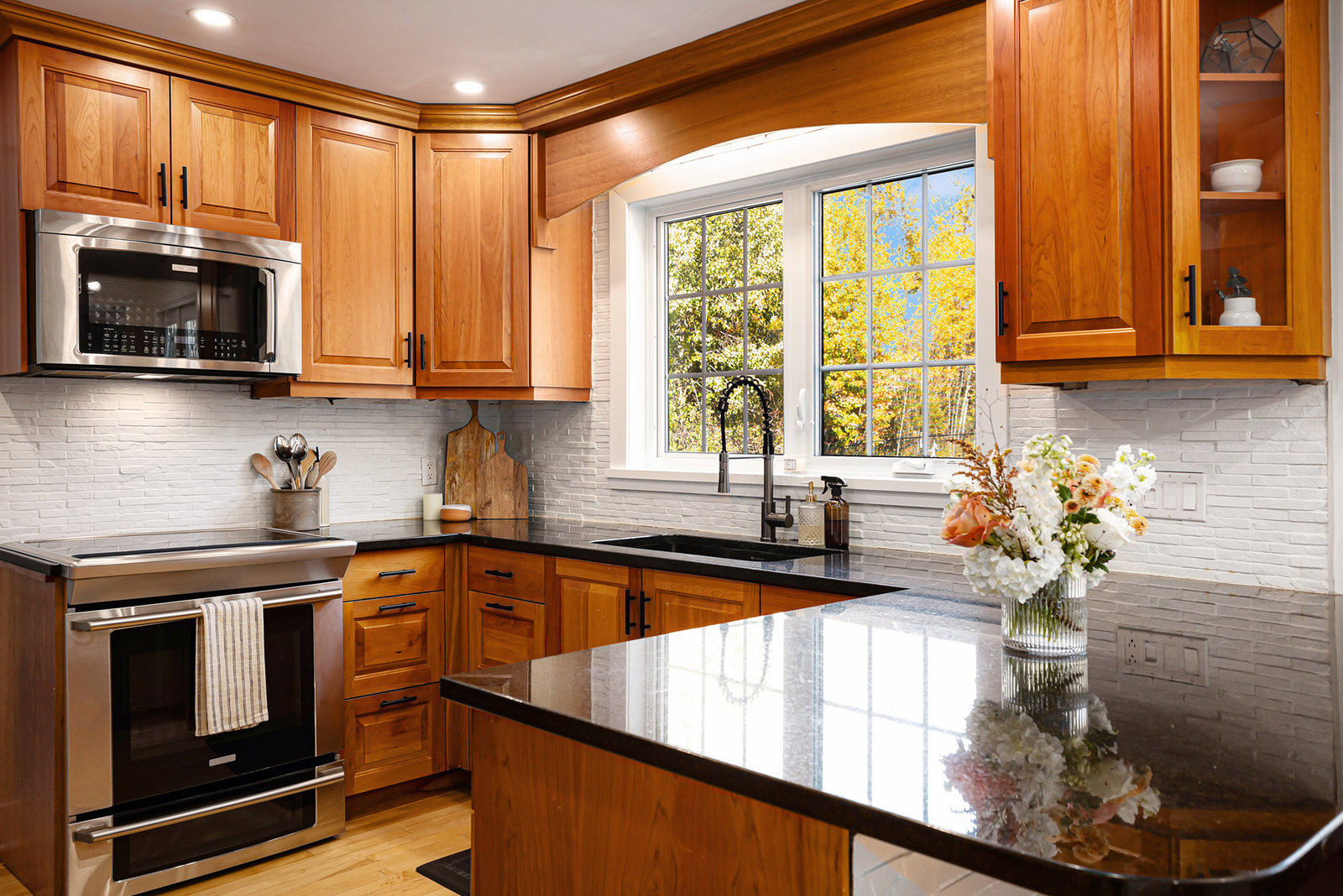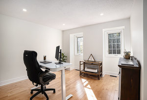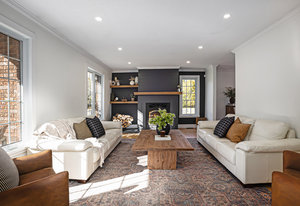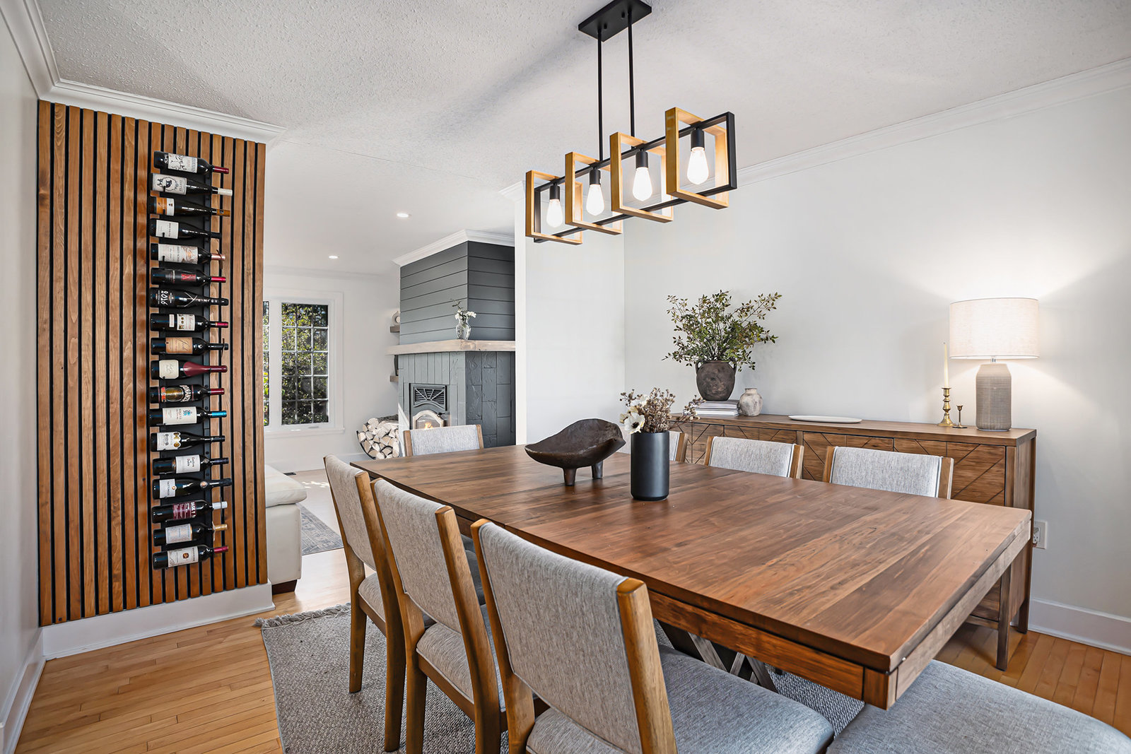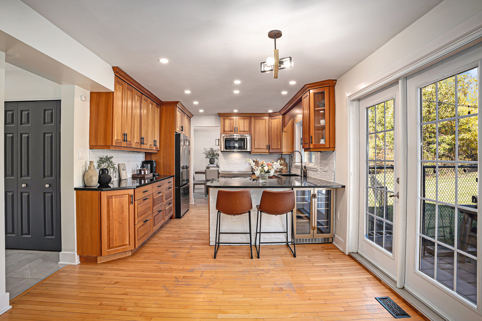 Inside, the main level showcases an open and inviting layout. The spacious living room is anchored by a warm wood-burning fireplace, perfect for cozy evenings, while the adjacent bright family room, also featuring a wood fireplace, serves as an ideal space for entertaining guests or relaxing with family. Oversized windows throughout flood the interior with abundant natural light, creating a cheerful and airy atmosphere and highlighting the rich hardwood flooring that runs seamlessly throughout the main and second floors.